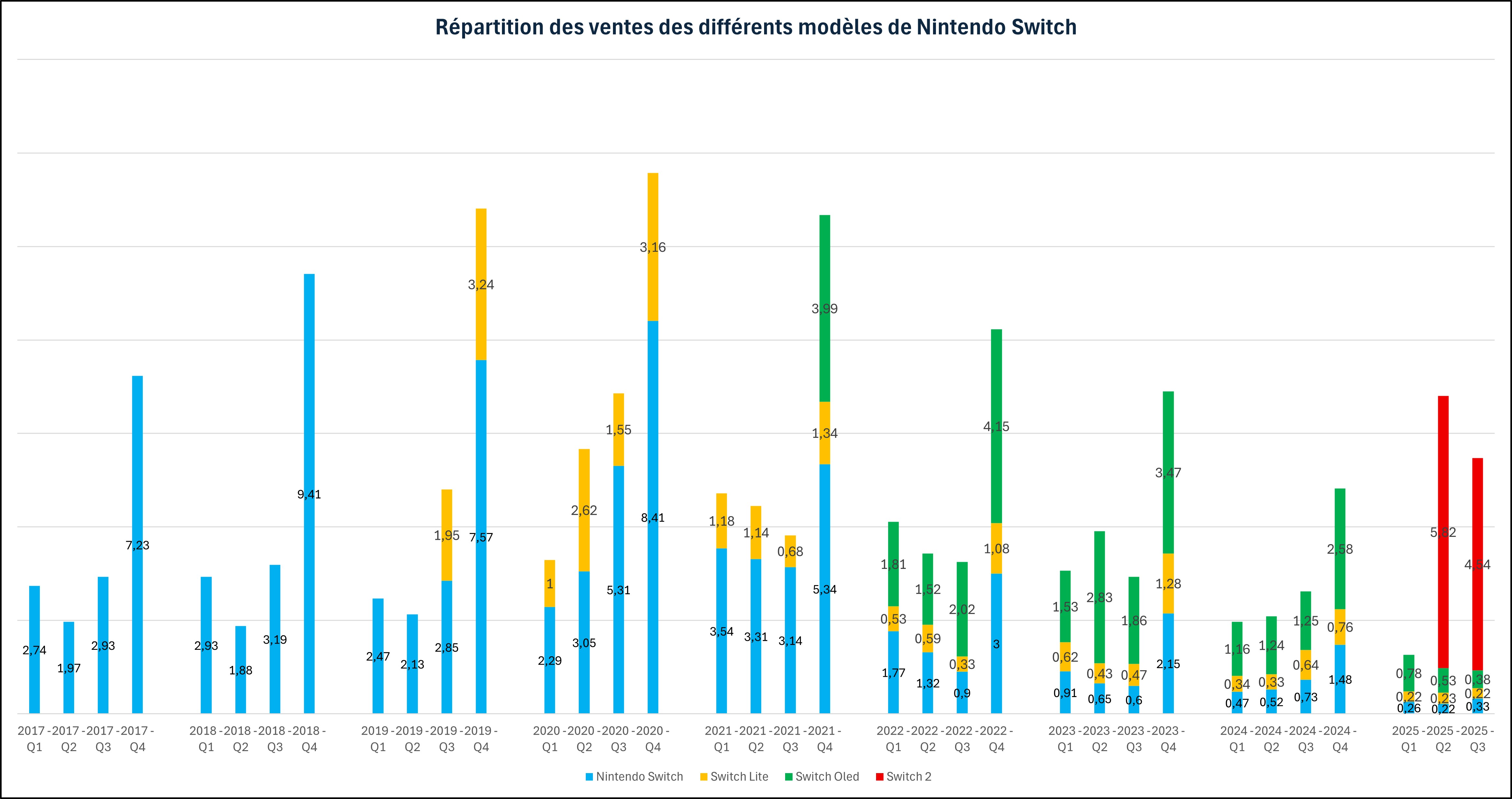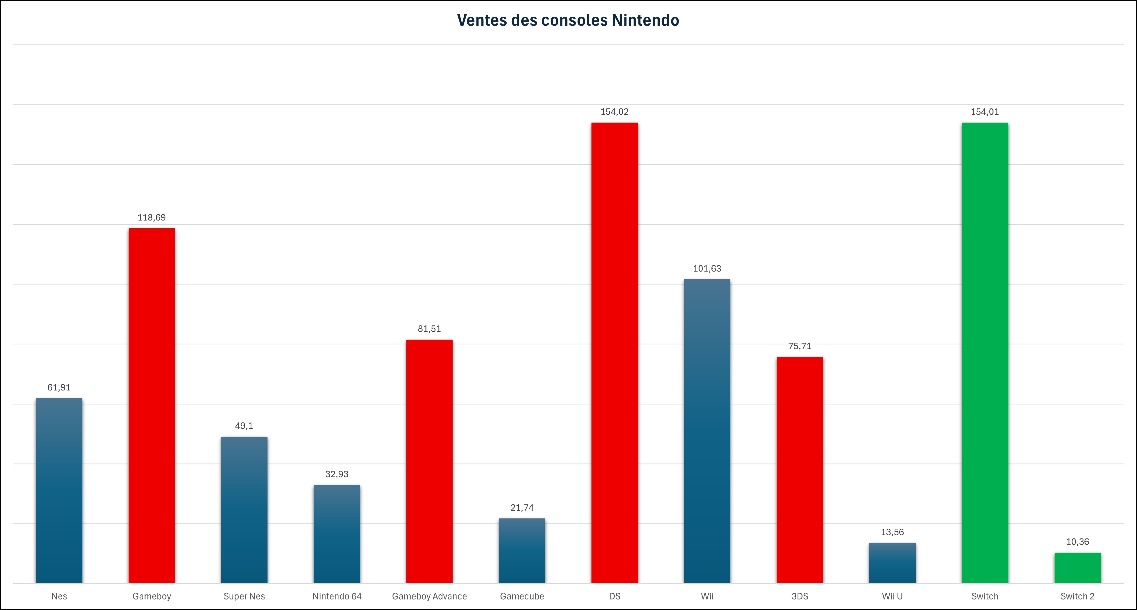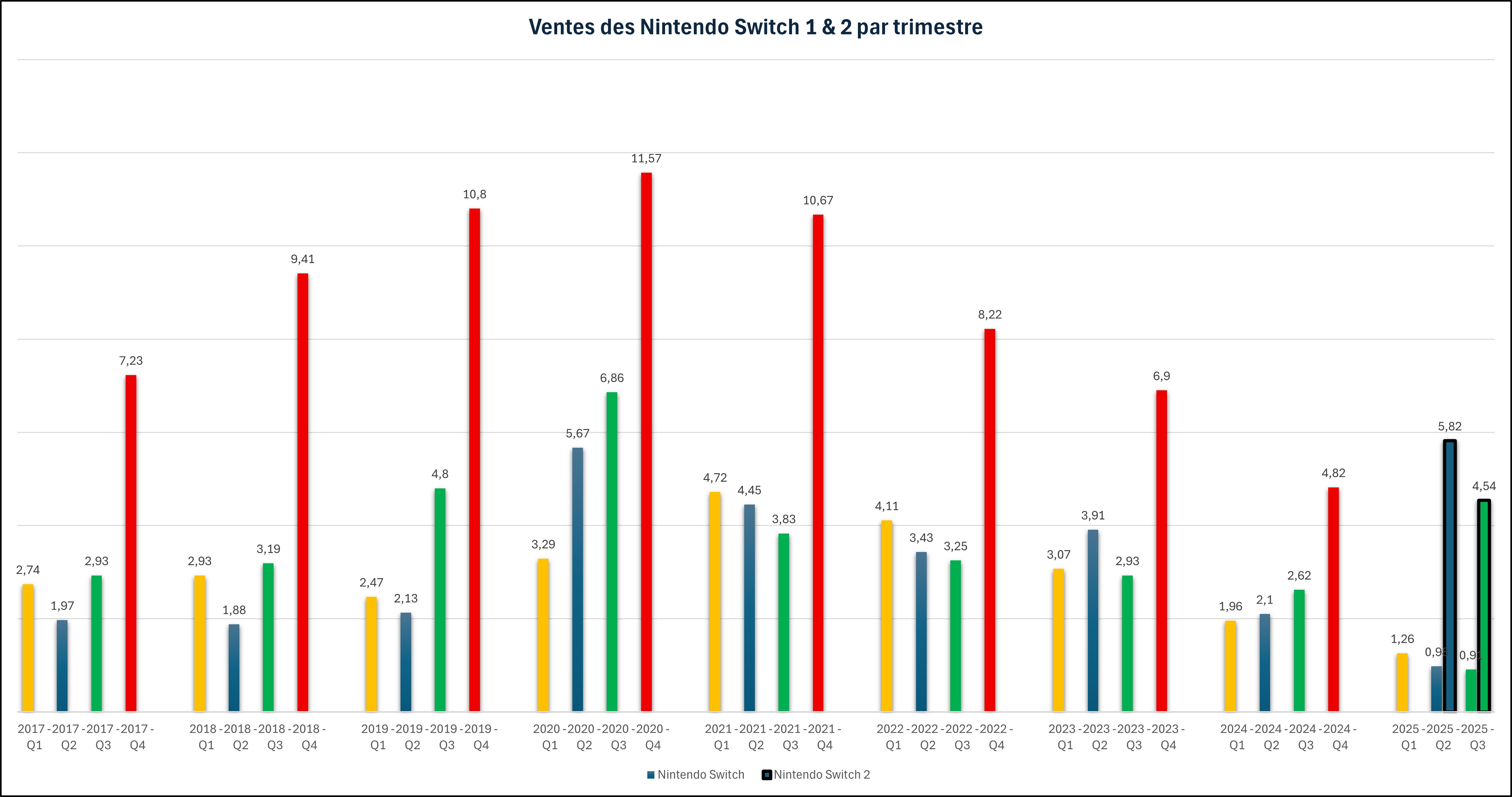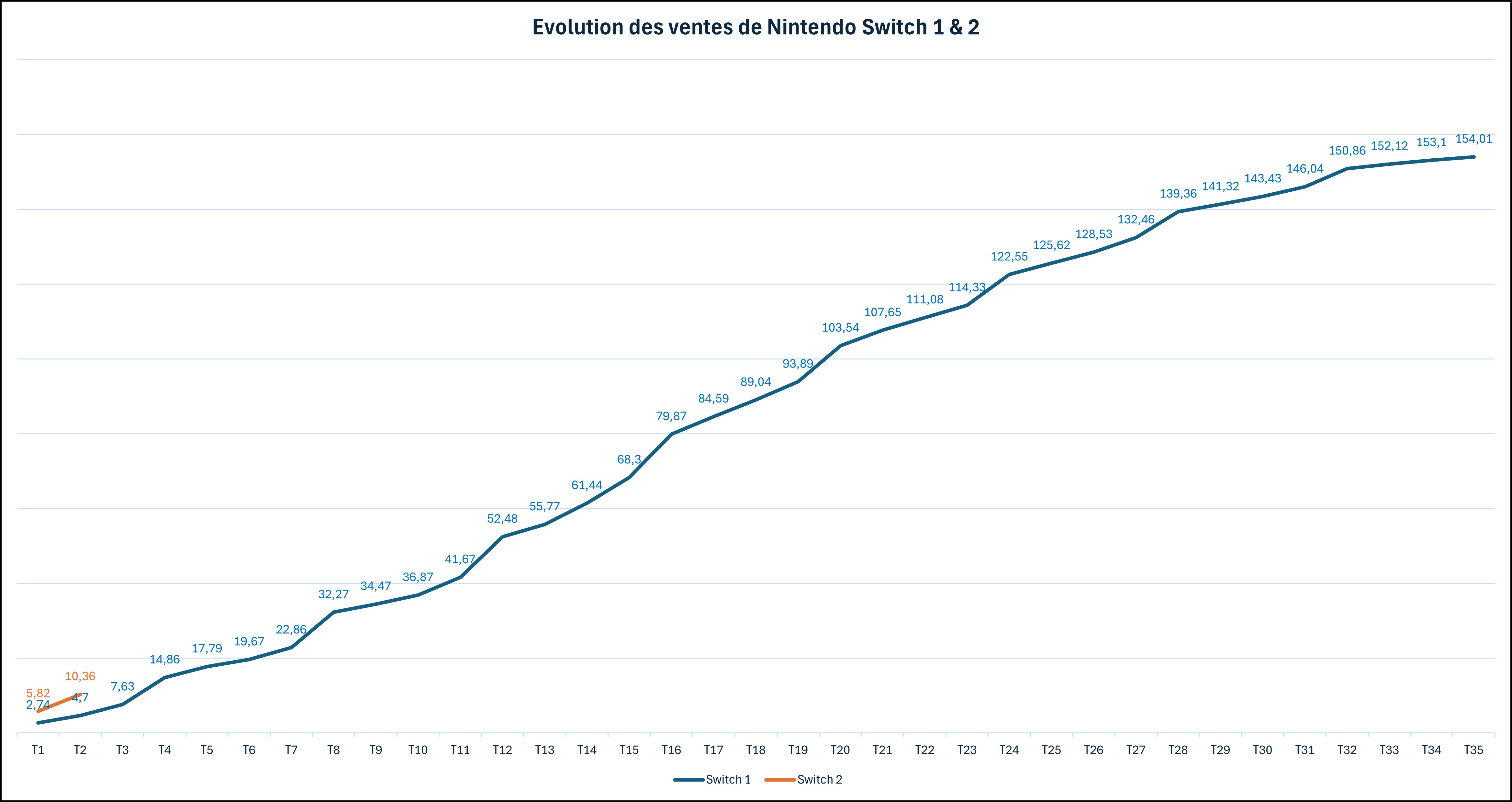 Que vos influenceurs préférés remballent leurs vidéos à charge contre la Nintendo Switch 2, tout va très bien pour Nintendo. Avec 4,54 millions d’unités écoulées lors du dernier trimestre, la dernière hybride de la firme dépasse déjà la barre des 10 millions d’unités écoulées. Avec ces performances, la console continue de s’inscrire comme la machine réalisant le meilleur démarrage de tous les temps, devant les PS4, PS5 ou même la première Nintendo Switch, alors même que la machine n’a toujours pas eu sa première période de fêtes. Avec ce très bon démarrage, Nintendo augmente ses prévisions pour la fin de l’exercice financier, passant de 15 millions à la fin du mois de mars à 19 millions à cette même date.