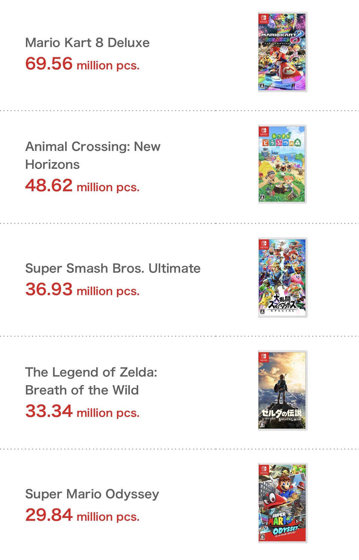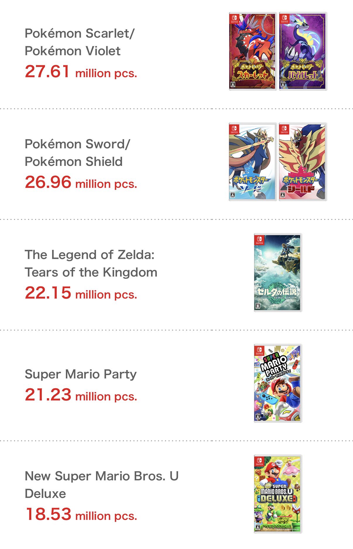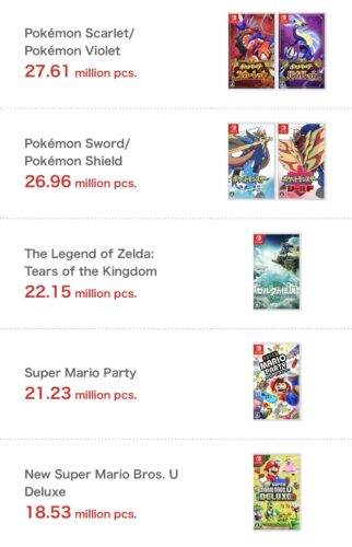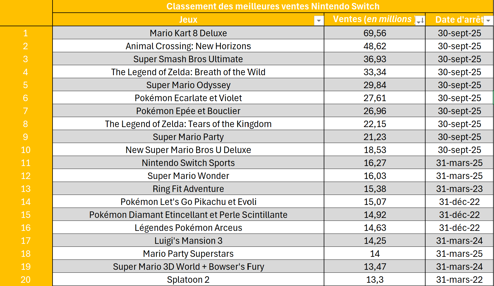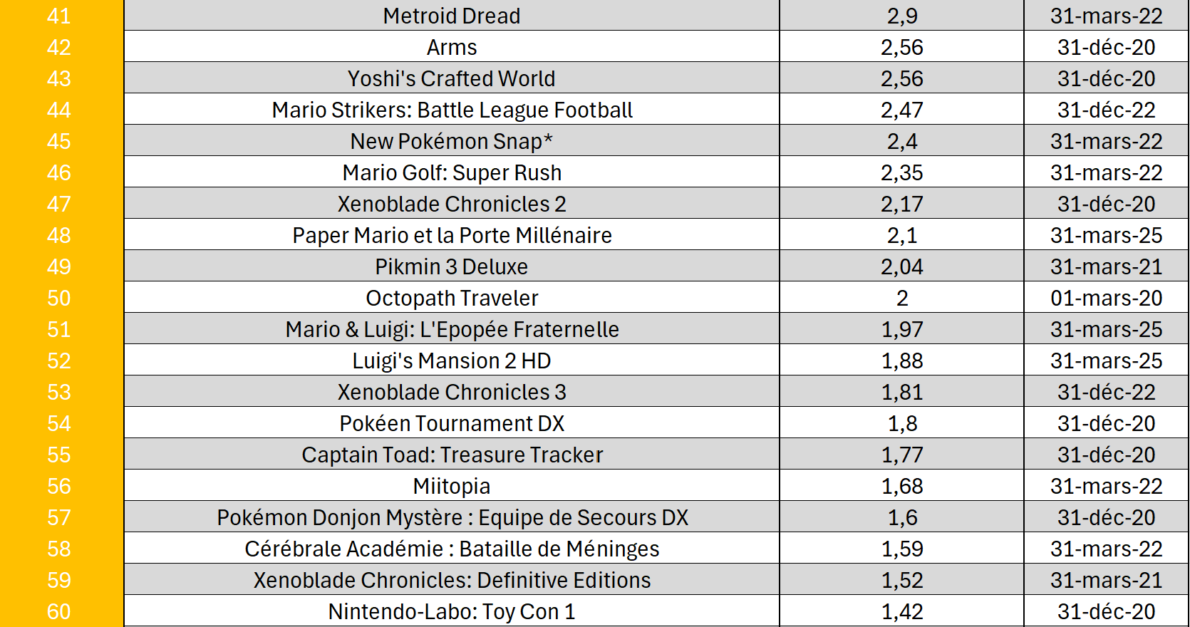 Pas grand-chose à signaler pour la première hybride : le top 10 de la console reste inchangé. On note malgré tout que plusieurs titres risquent de franchir des paliers importants avec les fêtes qui approchent : Mario Kart 8 Deluxe approche des 70 millions de ventes, Animal Crossing: New Horizons frôle les 50 millions et Super Mario Odyssey va bientôt passer les 30 millions. En dehors du top 10, seul un jeu obtient une actualisation de ses ventes (synonyme de la barre du million de ventes lors de l’exercice fiscal) c’est Super Mario Party Jamboree (probablement aidé par la Nintendo Switch 2 Edition, comptant dans le total Nintendo Switch). Avec 1,16 million de ventes supplémentaires, le titre culmine désormais à 8,64 millions de jeux vendus, et devrait passer la barre des 10 millions dans le prochain bilan financier.