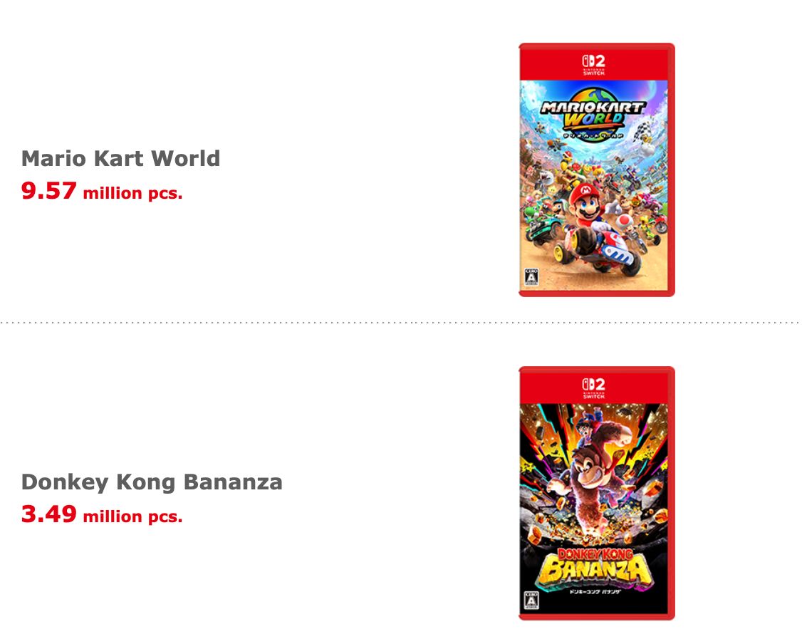 Les ventes de consoles se portent plutôt bien, les ventes de jeux également. Déjà concernant la dernière née de la firme, Mario Kart World continue de mener le top des ventes de la machine (et ne lâchera probablement jamais la première place). Avec 3,94 millions de ventes sur le dernier trimestre, le jeu de course s’approche déjà des 10 millions de ventes. À noter que 84% des consoles sont vendues avec le pack contenant le jeu, ce qui favorise la large adoption du titre. Pour son lancement, Donkey Kong Bananza réalise un démarrage solide avec 3,49 millions de ventes, séduisant environ un tiers des possesseurs de la machine. Il faudra voir les ventes à long terme pour juger de la performance globale du titre.