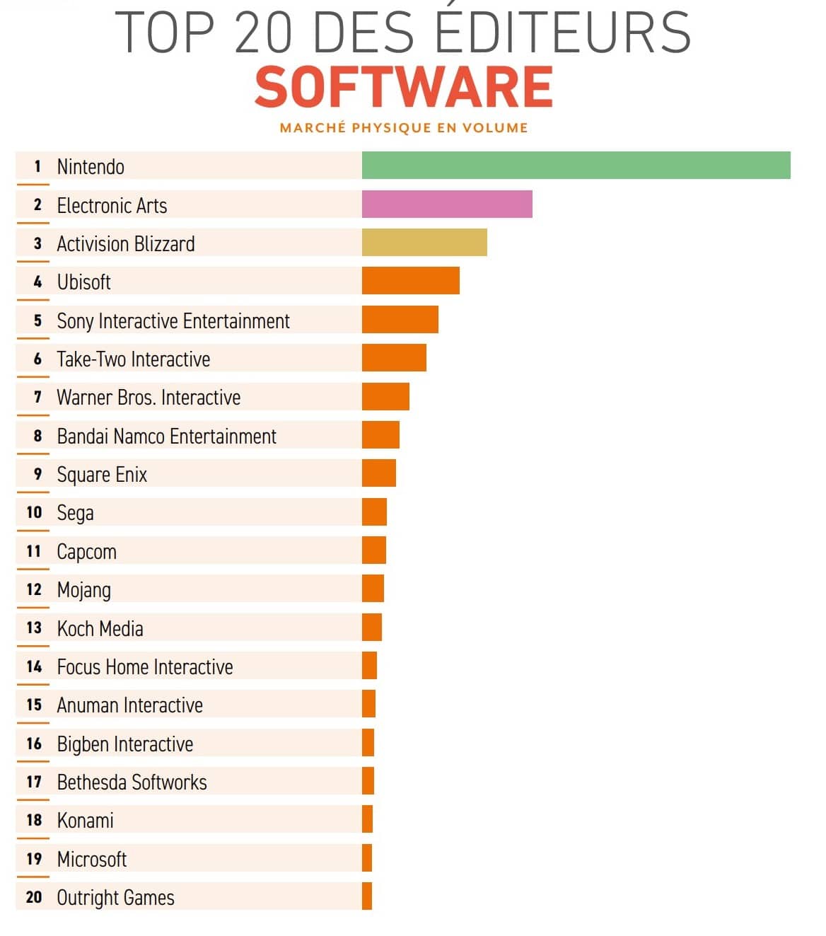 Terminons avec le classement des éditeurs en fonction du volume de jeux physiques vendus. À ce jeu-la, c’est une nouvelle fois Nintendo qui l’emporte avec une large avance sur Electronic Arts, deuxième du classement, tandis qu’Activision Blizzard vient compléter le podium ; on retrouve logiquement les trois éditeurs des jeux les plus vendus du classement ci-dessus.