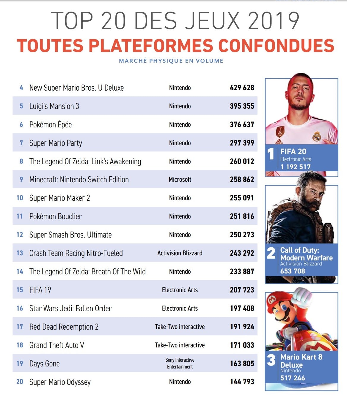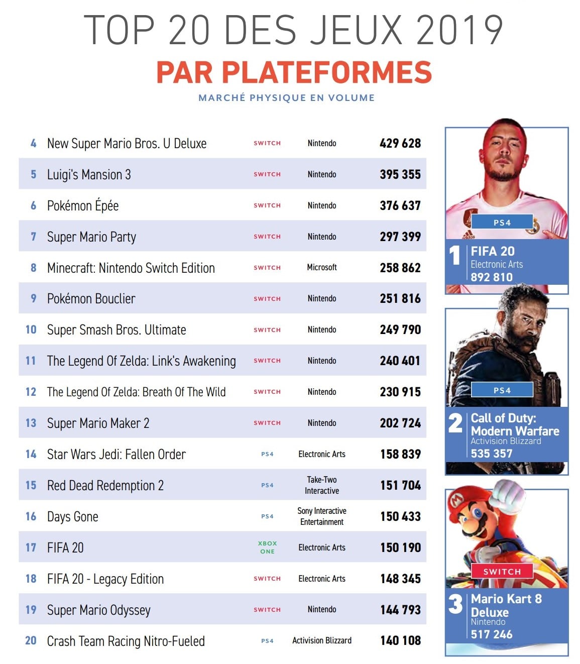 Le top des 20 du bilan des ventes physiques en France se compose de onze titres Nintendo Switch. Si le classement du S.E.L.L. indique Mario Kart 8 Deluxe en première position des jeux Switch, l’addition des deux versions de Pokémon permettrait à Pokémon Épée et Bouclier de prendre la troisième place du classement. Les jeux sortis en 2019 sur la Nintendo Switch se retrouvent en bonne position dans le classement : New Super Mario Bros U Deluxe est quatrième et Luigi’s Mansion 3 est cinquième. On retrouve également The Legend of Zelda : Link’s Awakening et Super Mario Maker 2. Les titres issus du catalogue Switch des précédentes années continuent de se vendre : c’est le cas notamment de Super Mario Party, Super Smash Bros. Ultimate, The Legend of Zelda: Breath of the Wild et Super Mario Odyssey. La véritable performance de ce classement provient une nouvelle fois de Mario Kart 8 Deluxe qui se place troisième du classement (ou quatrième, selon la façon de compter les versions Pokémon) derrière FIFA 20 et Call of Duty: Modern Warfare.