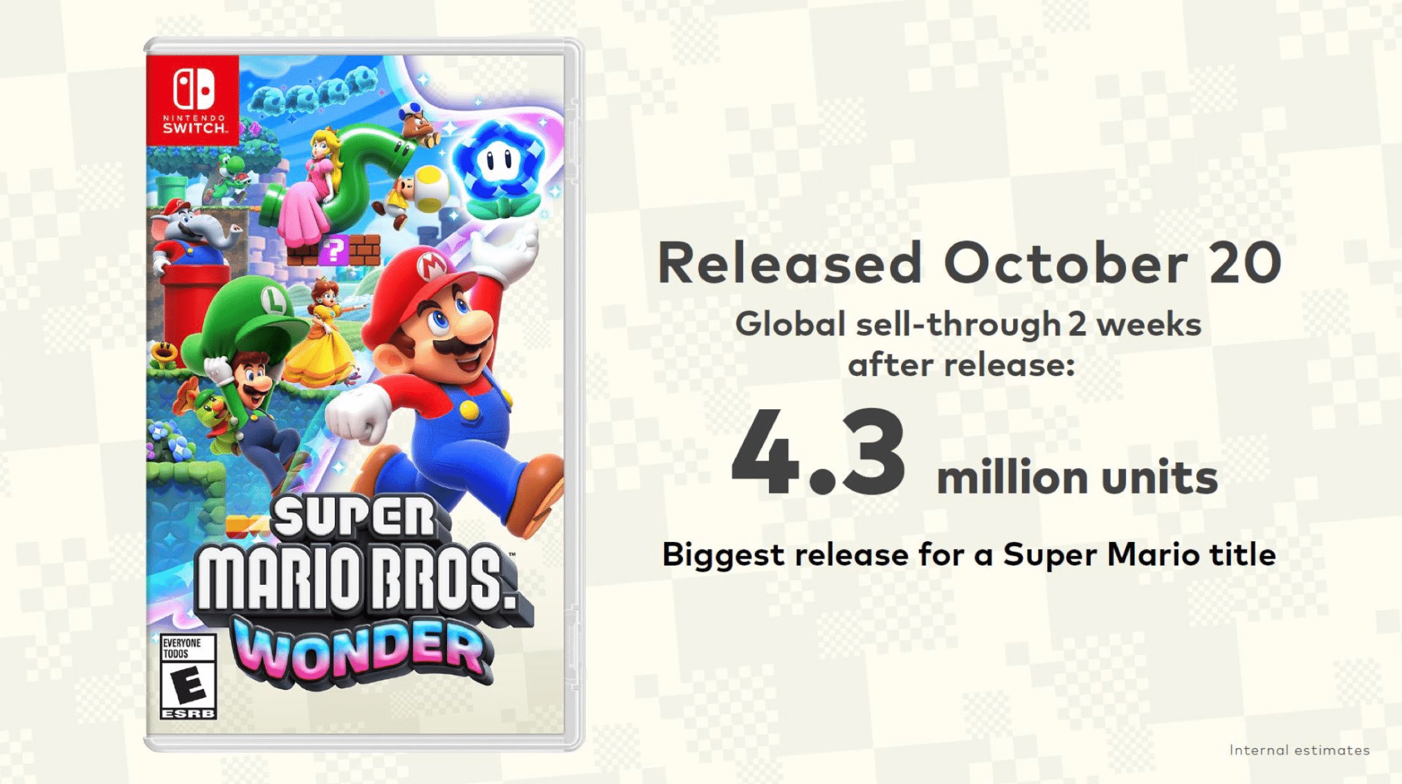 En parallèle des sorties du trimestre, le constructeur japonais à glissé quelques mots sur la série Mario en indiquant tout d’abord les ventes de la dernière sortie lors du rapport : Super Mario Bros Wonder. Avec 4,3 millions d’unités écoulées, ce dernier s’inscrit comme le meilleur démarrage de la série Super Mario et va certainement continuer de grimper dans le top des ventes de jeux Switch avec de très bonnes ventes sur la longueur (qu’on a déjà pu observer dans les différents tops par pays). Rajoutons également à ça la volonté de Nintendo de soutenir la sortie du film Mario avec de nombreuses sorties de la franchise prévue pour 2023 et 2024.