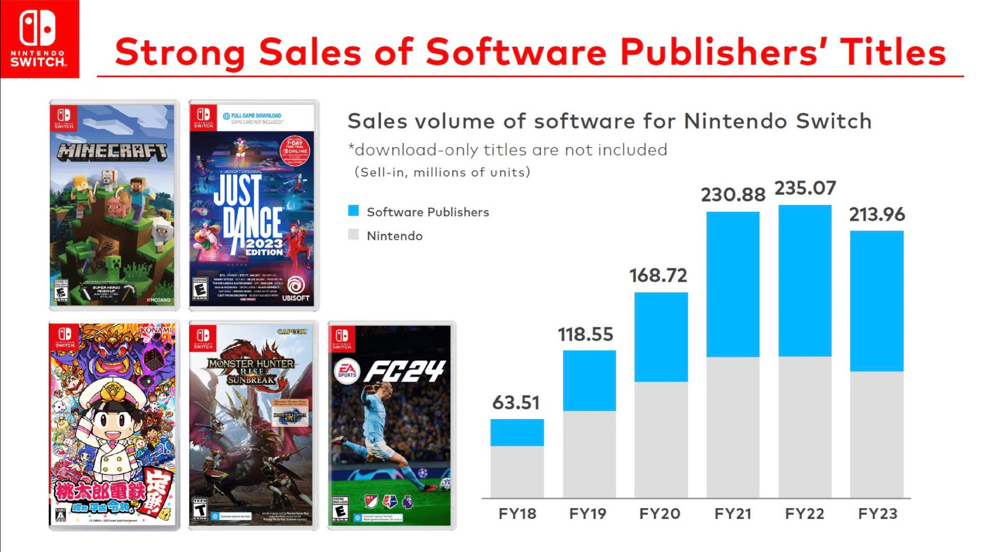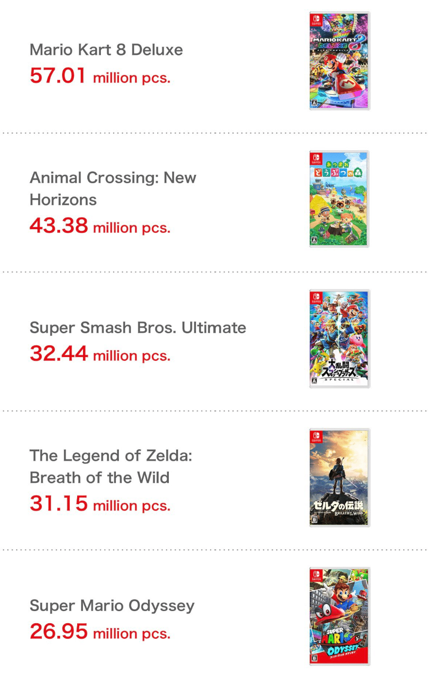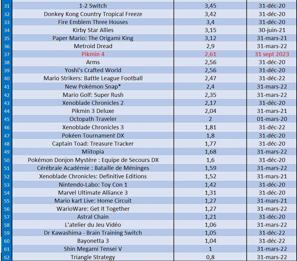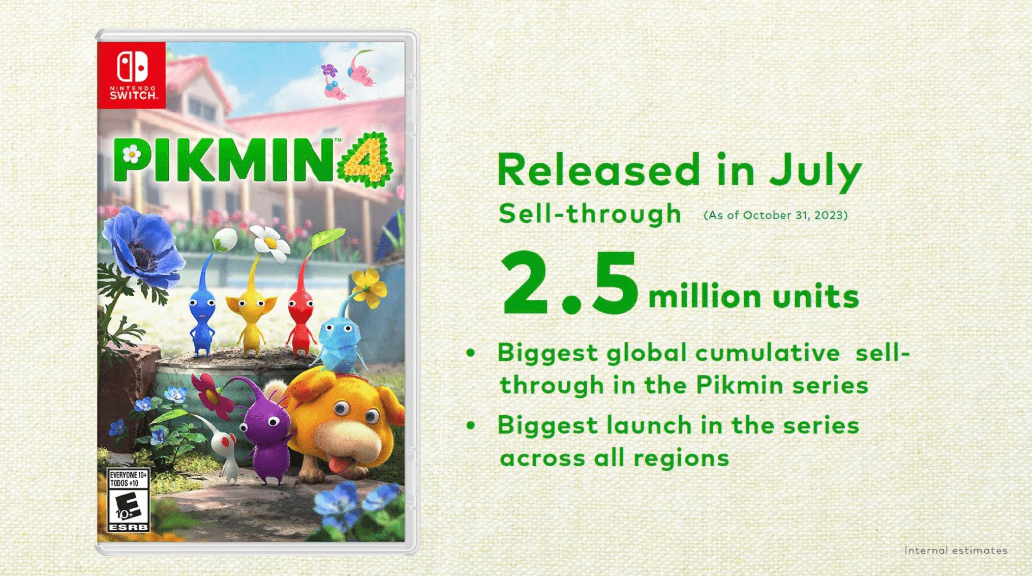 L’autre sortie majeure pour Nintendo, Pikmin 4, réalise un très bon démarrage en s’inscrivant immédiatement comme la meilleure vente de la série avec 2,5 millions de ventes. C’est tout de même dommage que cette licence ne parvienne pas à vraiment rencontrer le succès qu’elle mérite en franchissant d’autres caps significatifs. Nintendo indique également que depuis quelques années, les éditeurs tiers font jeu égal avec la firme nippone en matière de ventes sur la Switch, un fait rare sur une console du constructeur. Ceci s’explique notamment par la sortie de gros titres tiers comme les FIFA, Monster Hunter ou encore Momotaro qui est un gros succès au Japon.