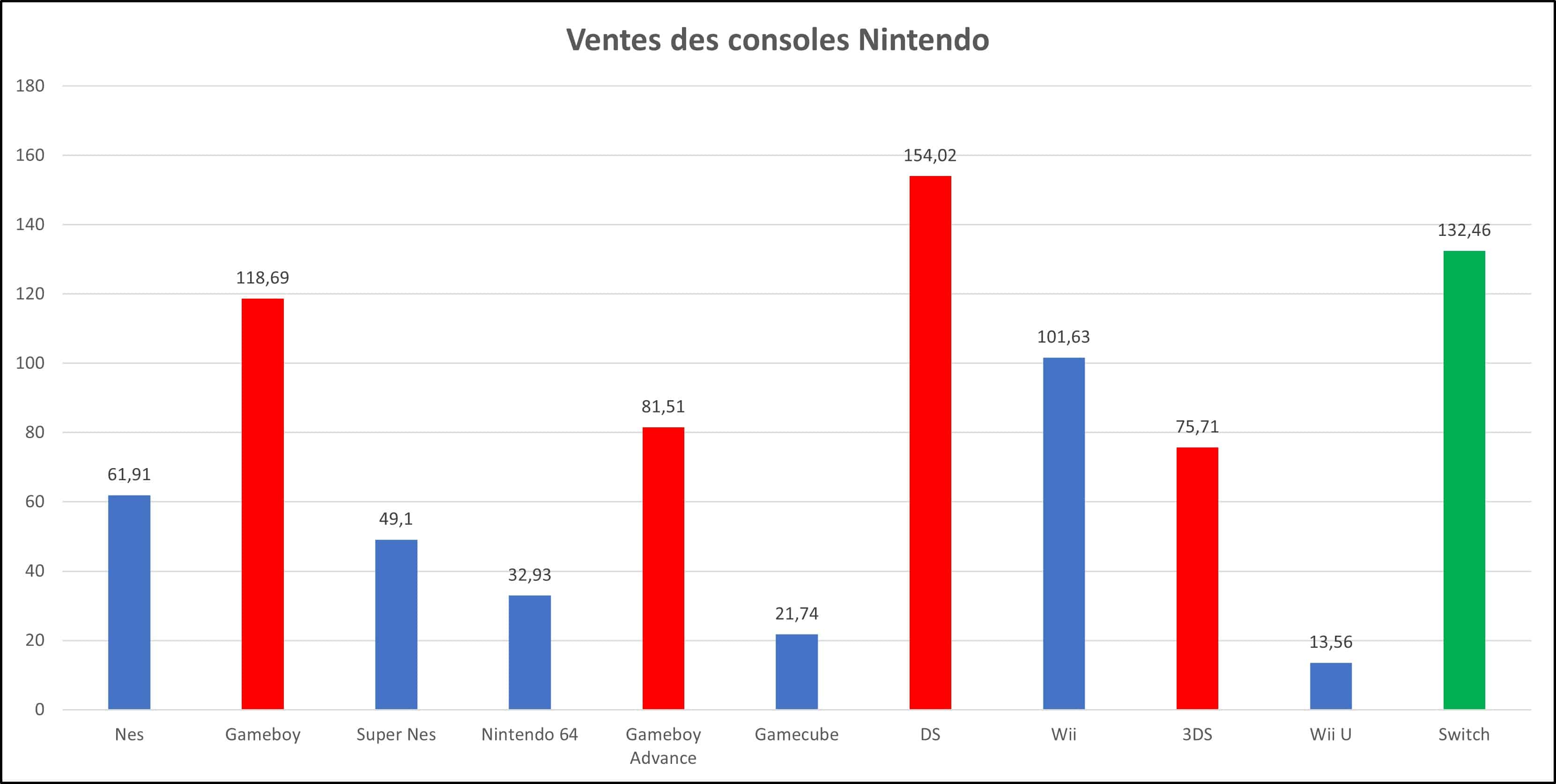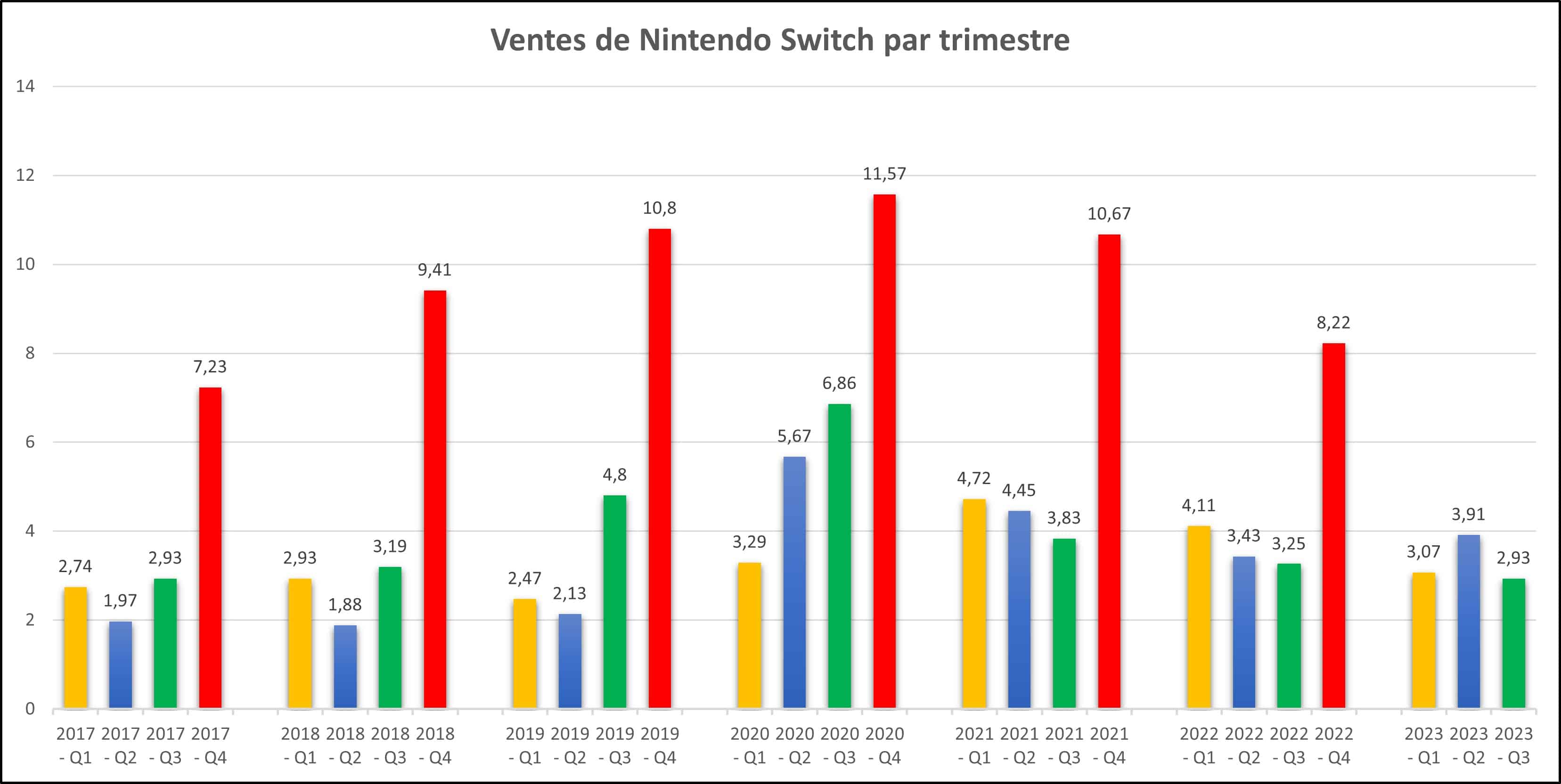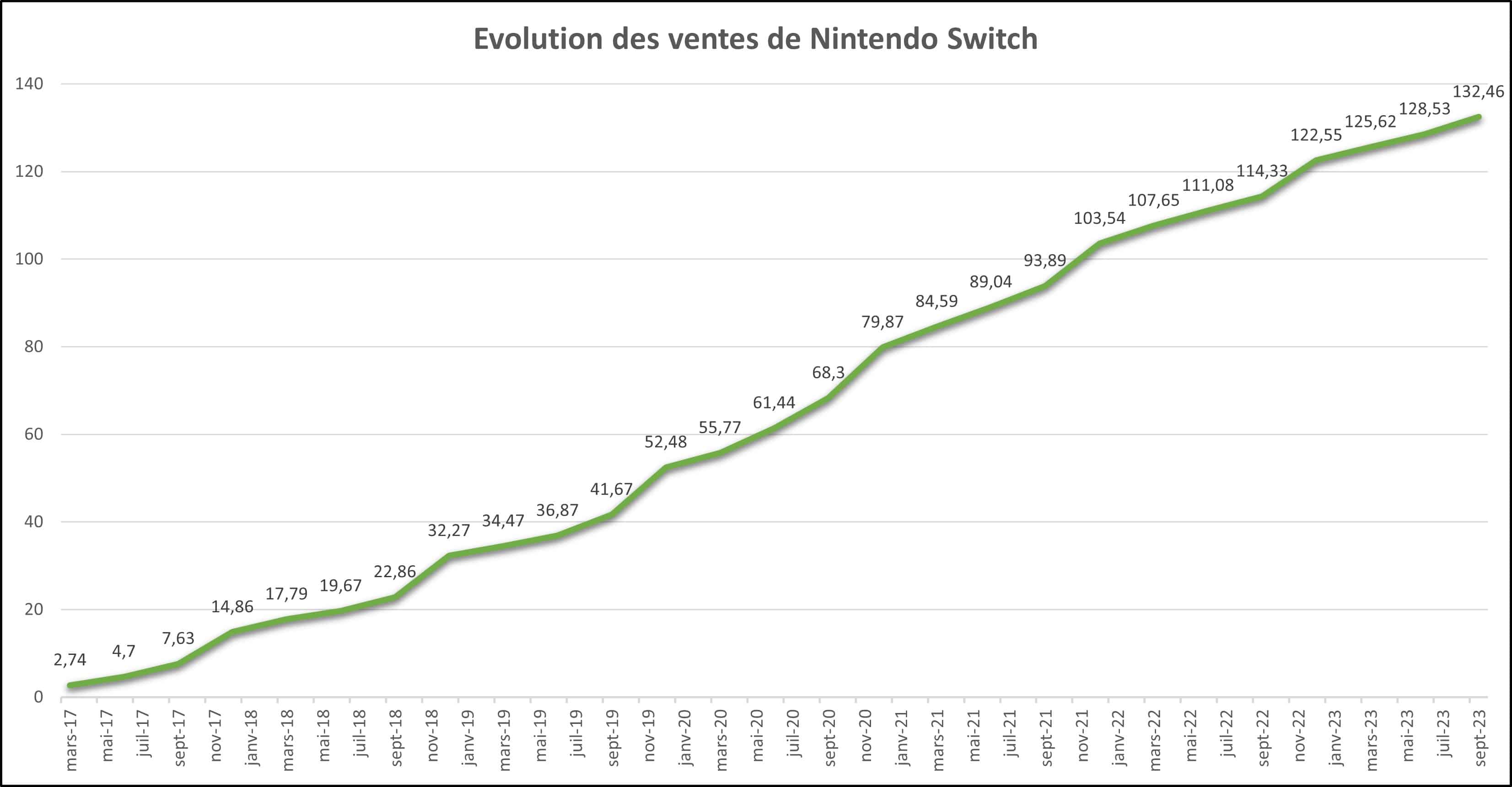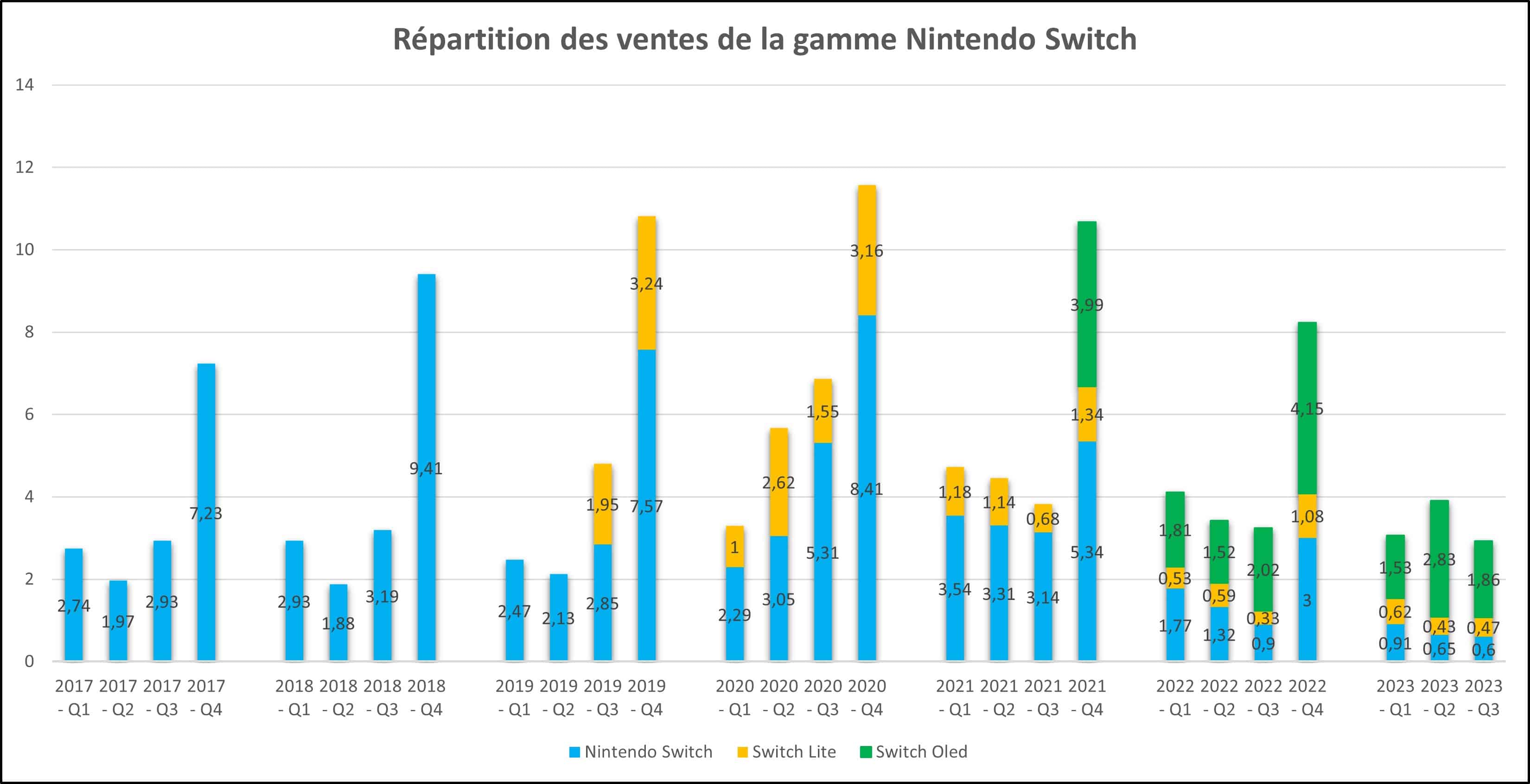 Comme dit en introduction, les ventes de la Switch sont reparties à la hausse, presque par miracle, grâce à la sortie de la suite de Breath of the Wild. Ce trimestre, les ventes accusent un peu plus le coup, malgré un résultat de 2,93 millions de ventes plus que satisfaisant pour une machine qui fêtera bientôt ses 7 ans. Le total de la console s’élève désormais à 132,46 millions. Il ne reste toujours que la Nintendo DS et la PS2 au-delà de ce total, deux consoles qu’il sera très difficile à aller chercher si l’on estime que la console hybride dépassera de peu les 140 millions de ventes lors de la fin de l’année fiscale en mars 2024. Par ailleurs, les ventes sont, comme le dernier trimestre, largement en faveur du modèle OLED qui est clairement le plus plébiscité.