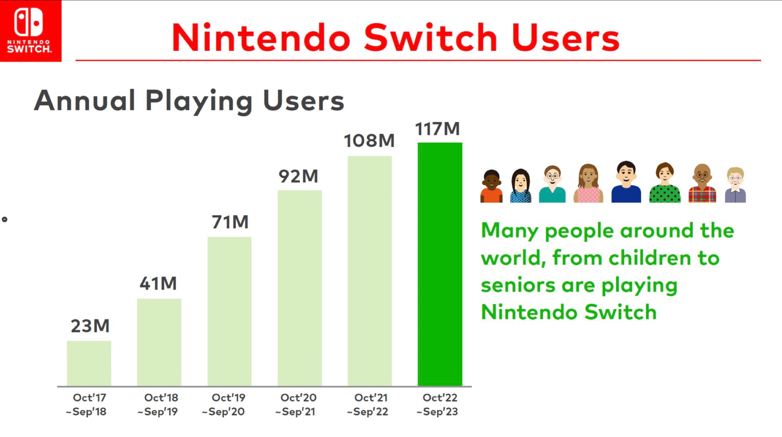 En plus des données sur les ventes de jeux, on apprend que 38 millions de personnes ont souscrit à un abonnement du Nintendo Switch Online, sans connaître la répartition entre les abonnements de base et ceux du pack additionnel. Autre donnée intéressante, lors du dernier trimestre 117 millions de comptes ont été actifs sur la console hybride, représentant une belle partie des 132 millions de consoles vendues : oui, le public continue de jouer à la Nintendo Switch.