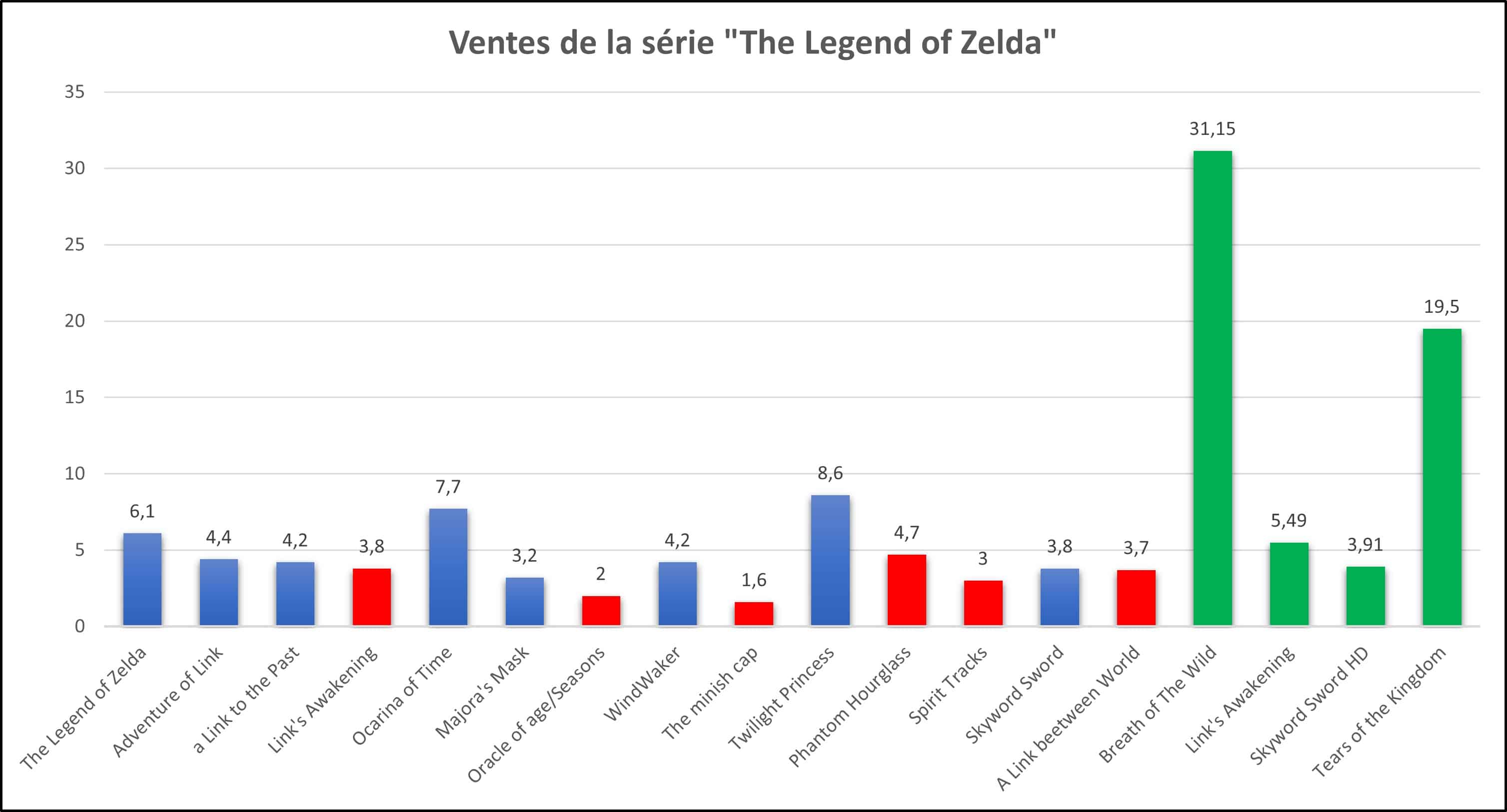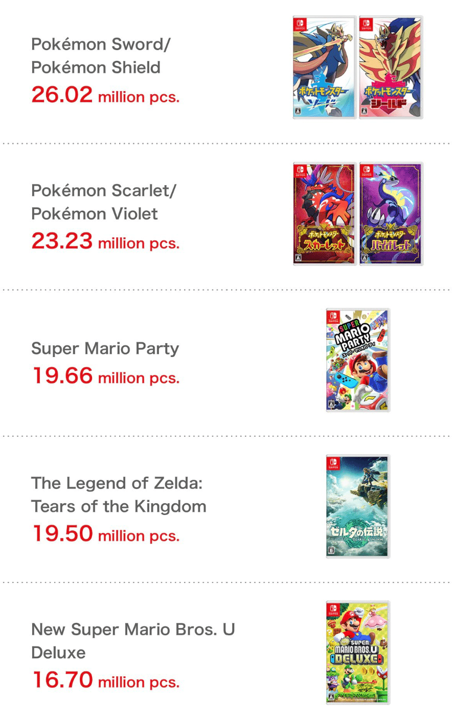 Le top 10 des ventes de jeux sur la console de Nintendo conserve les mêmes titres. Seuls Super Mario Odyssey et la huitième génération de Pokémon échangent leurs places. Mario kart 8 Deluxe continue de régner en maître sur sa console en s’approchant très rapidement des 60 millions de ventes, qu’il pourrait franchir à Noël. The Legend of Zelda: Tears of the Kingdom approche quant à lui des 20 millions de ventes, qu’il devrait franchir d’ici peu également. Nintendo indique par ailleurs que la série à franchi un cap sur Nintendo Switch, avec des ventes jamais atteintes et une longévité record. Pour finir avec ce top 10, Pokémon Écarlate et Violet devraient terminer sa carrière assez proche des ventes de la précédente génération après la publication du deuxième pack de DLC et les ventes de son second Noël.