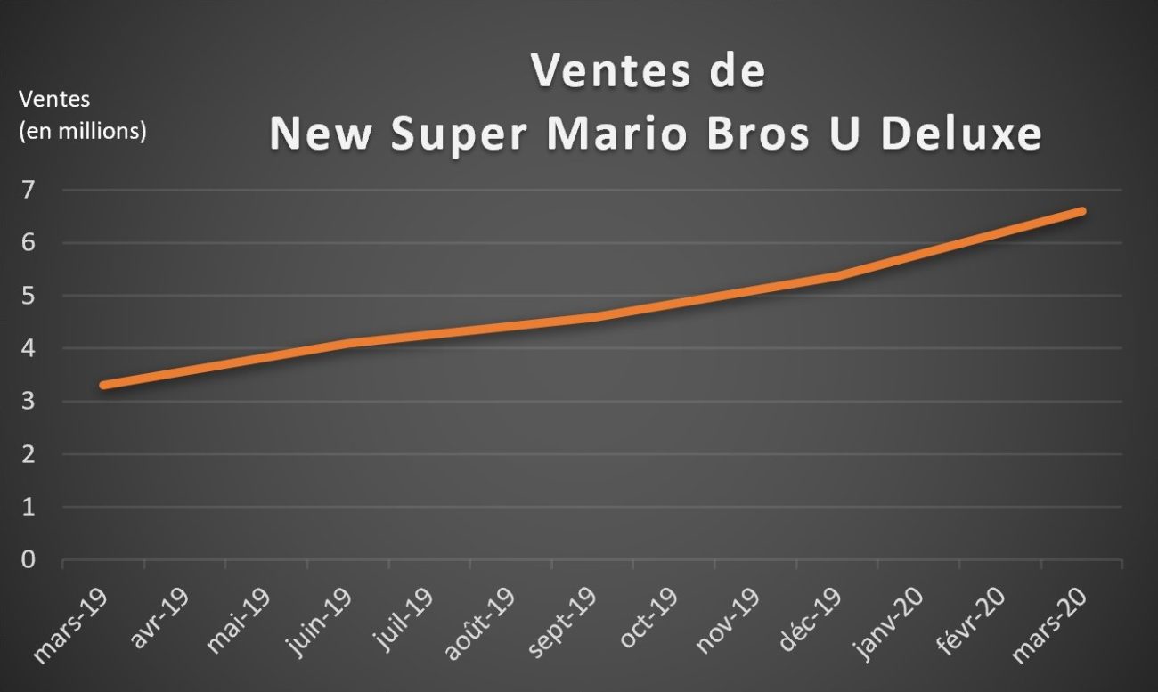 - Pour finir ce top 10 des ventes de la Nintendo Switch, on retrouve New Super Mario Bros U Deluxe, seul titre en deçà des dix millions de ventes avec 6,6 millions d’exemplaires ayant trouvé preneur.