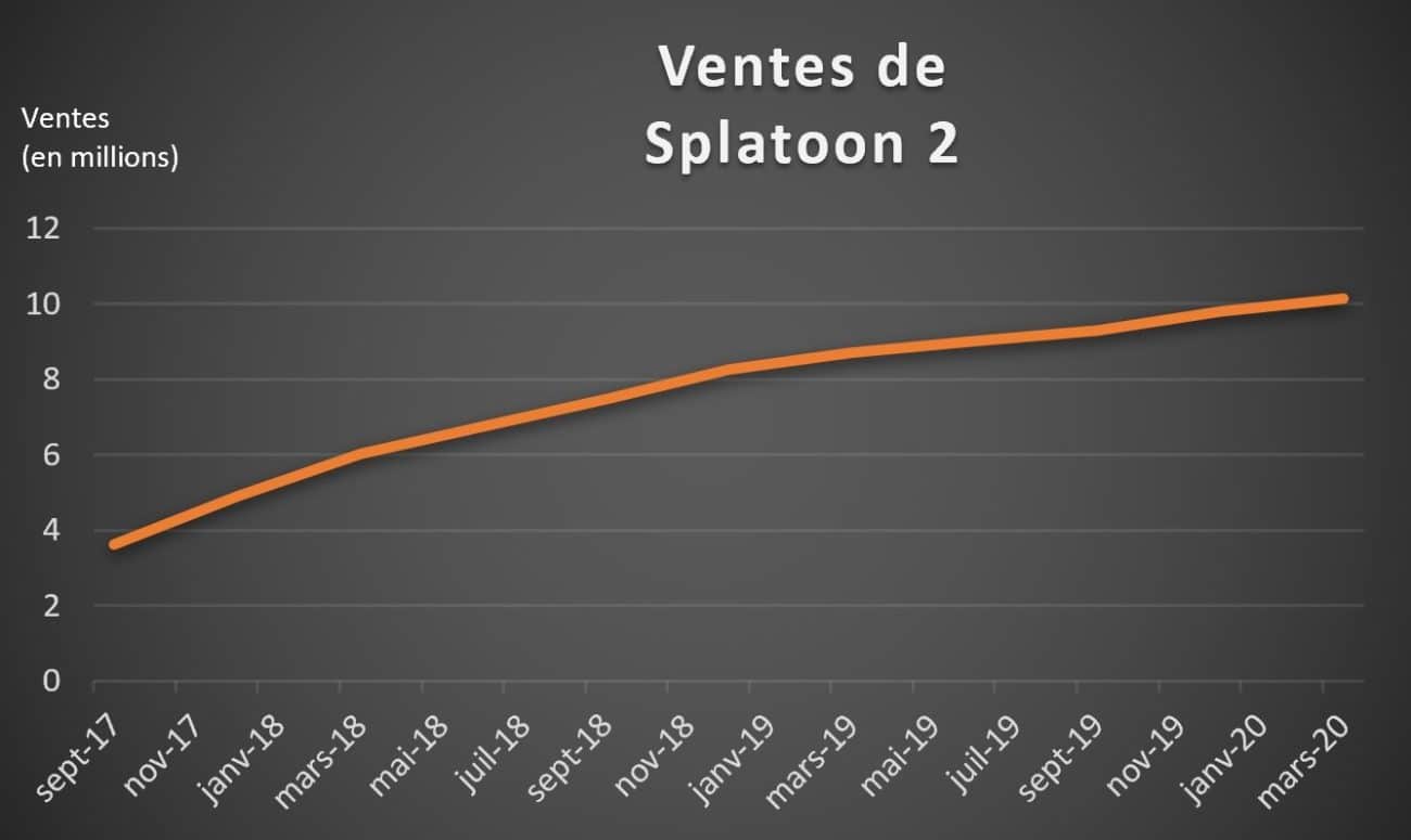 - Derrière Animal Crossing: New Horizons, deux jeux dépassent le cap des 10 millions de ventes. Le premier d’entre eux est Splatoon 2 : le shooter sorti en 2017 a vu ses ventes considérablement baisser (320 000 exemplaires lors du dernier trimestre) depuis l’arrêt du soutien du jeu. Cela n’a pas empêché le titre de rejoindre le club, plus si fermé que ça, des « ten millions sellers » de la Nintendo Switch.