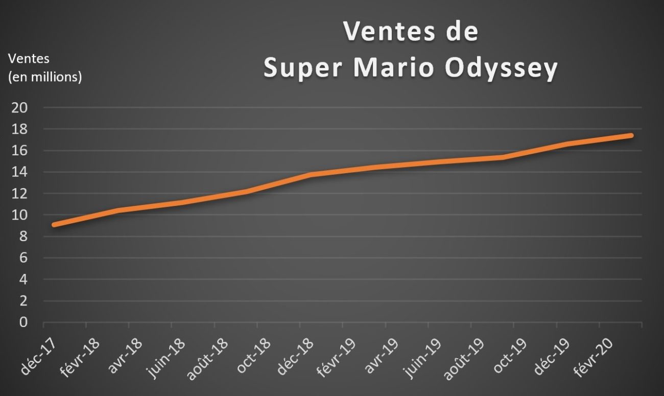 - Juste derrière, on retrouve donc Super Mario Odyssey, Mario 3D le plus vendu de l’histoire. Les ventes de ce dernier s’élèvent aujourd’hui à 17 410 000 exemplaires grâce à 820 000 jeux écoulés en plus lors du dernier trimestre.