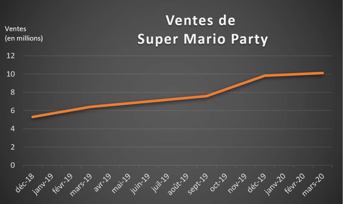 - L’autre titre à rejoindre ce club est Super Mario Party, premier épisode de la série à dépasser le stade des dix millions de ventes. Sur la dernière période, les chiffres du party game restent conséquents en avoisinant le million d’exemplaires écoulés.