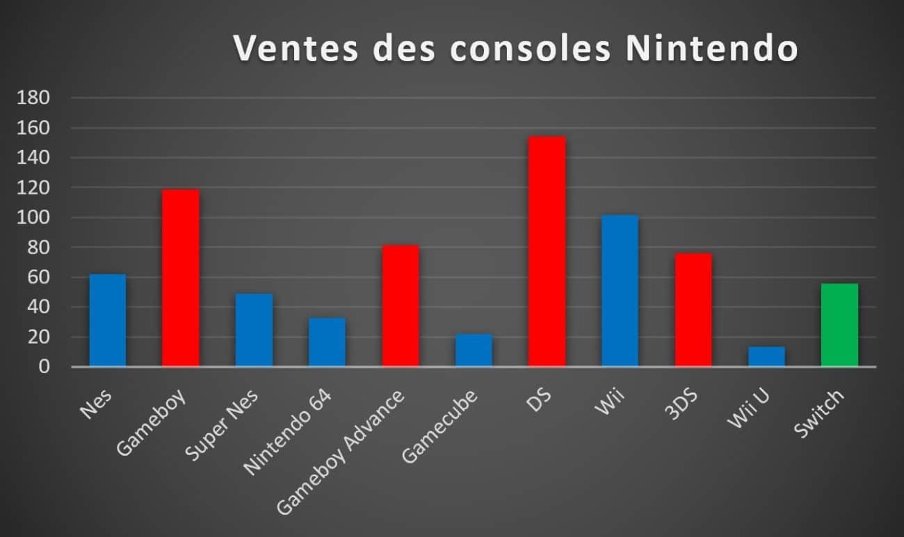 - Le jeu le plus vendu de la Nintendo Switch reste encore Mario Kart 8 Deluxe : ce n’est pas vraiment une surprise, ce dernier est continuellement présent dans les tops de ventes de jeux, que ce soit en France ou au Japon. Avec 1,81 millions d’exemplaires vendus en plus lors du dernier trimestre, le dernier jeu de course de Nintendo culmine aujourd’hui à 24,77 millions de ventes. Ces chiffres lui permettent de devenir le deuxième Mario Kart le plus vendu, devant l’épisode DS et derrière l’épisode Wii.