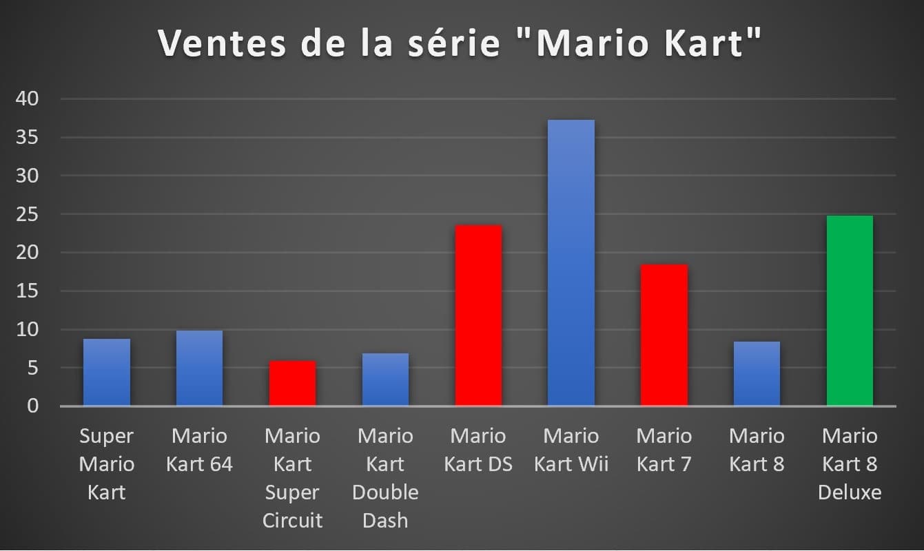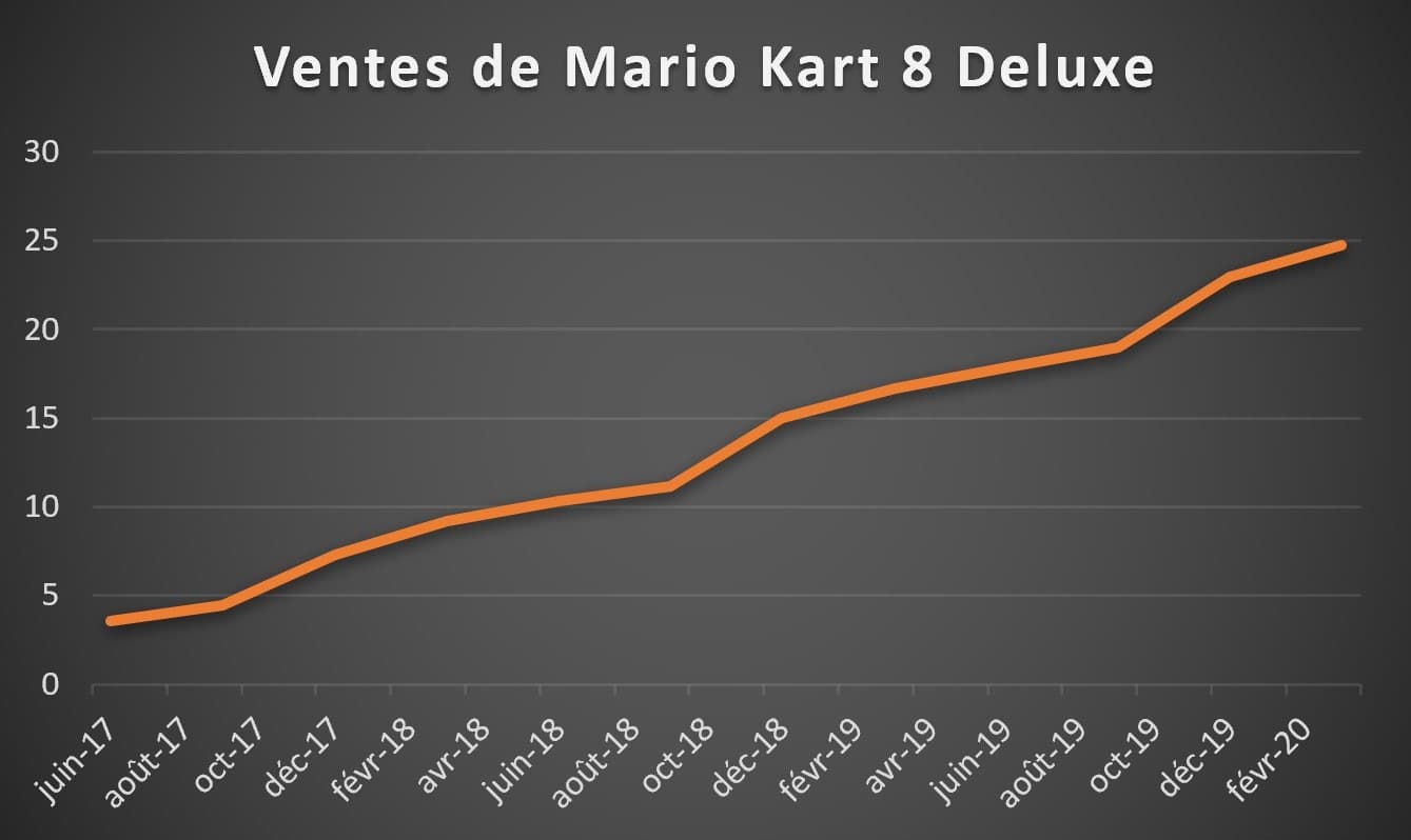 - Le jeu le plus vendu de la Nintendo Switch reste encore Mario Kart 8 Deluxe : ce n’est pas vraiment une surprise, ce dernier est continuellement présent dans les tops de ventes de jeux, que ce soit en France ou au Japon. Avec 1,81 millions d’exemplaires vendus en plus lors du dernier trimestre, le dernier jeu de course de Nintendo culmine aujourd’hui à 24,77 millions de ventes. Ces chiffres lui permettent de devenir le deuxième Mario Kart le plus vendu, devant l’épisode DS et derrière l’épisode Wii.
