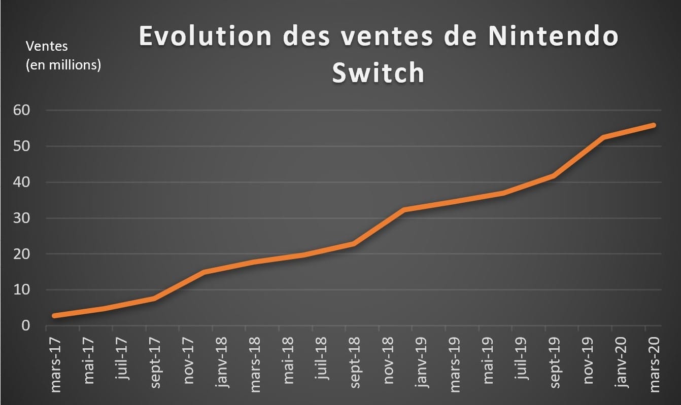 Lors du dernier trimestre de l’année fiscale 2019-2020, Nintendo a écoulé 3,29 millions de Nintendo Switch portant le total de la machine à 55,77 millions d’exemplaires. Sur l’année complète, la machine hybride s’est vendue au-delà de 21 millions d’unités. Les objectifs de Nintendo consistant à livrer 1,8 million de consoles sur le dernier trimestre ont donc largement été atteints. Pour finir, parlons des objectifs pour la prochaine année fiscale : la firme de Kyoto prévoit d’écouler 19 millions de Switch sur la prochaine période. Pour rappel, les objectifs initiaux de Nintendo étaient de vendre 18 millions de Switch en 2019-2020, estimations rehaussées à 19,5 millions en janvier dernier.