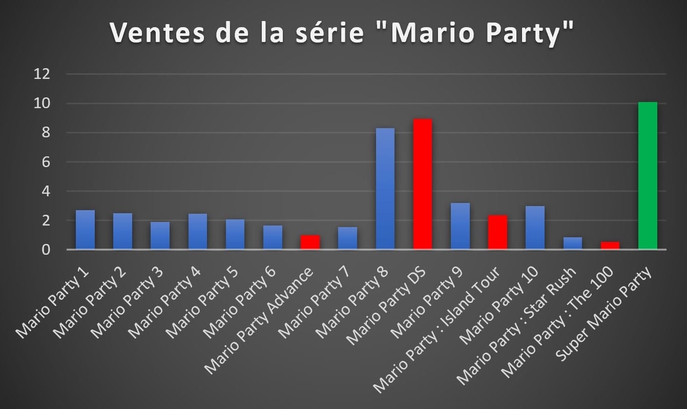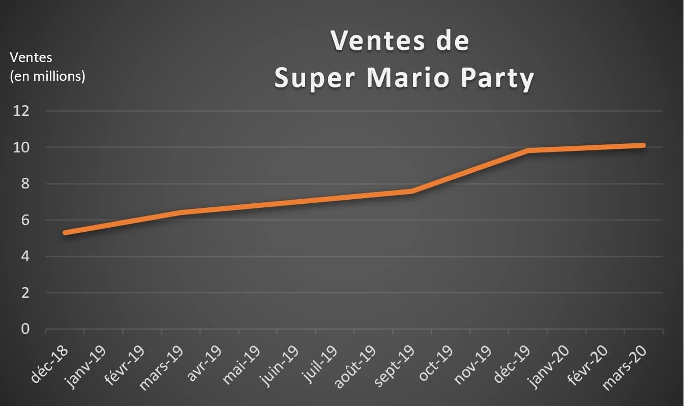 - L’autre titre à rejoindre ce club est Super Mario Party, premier épisode de la série à dépasser le stade des dix millions de ventes. Sur la dernière période, les chiffres du party game restent conséquents en avoisinant le million d’exemplaires écoulés.