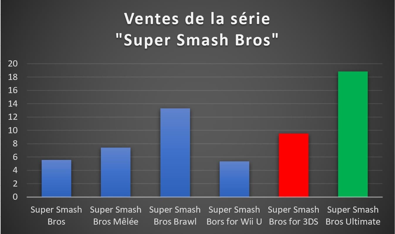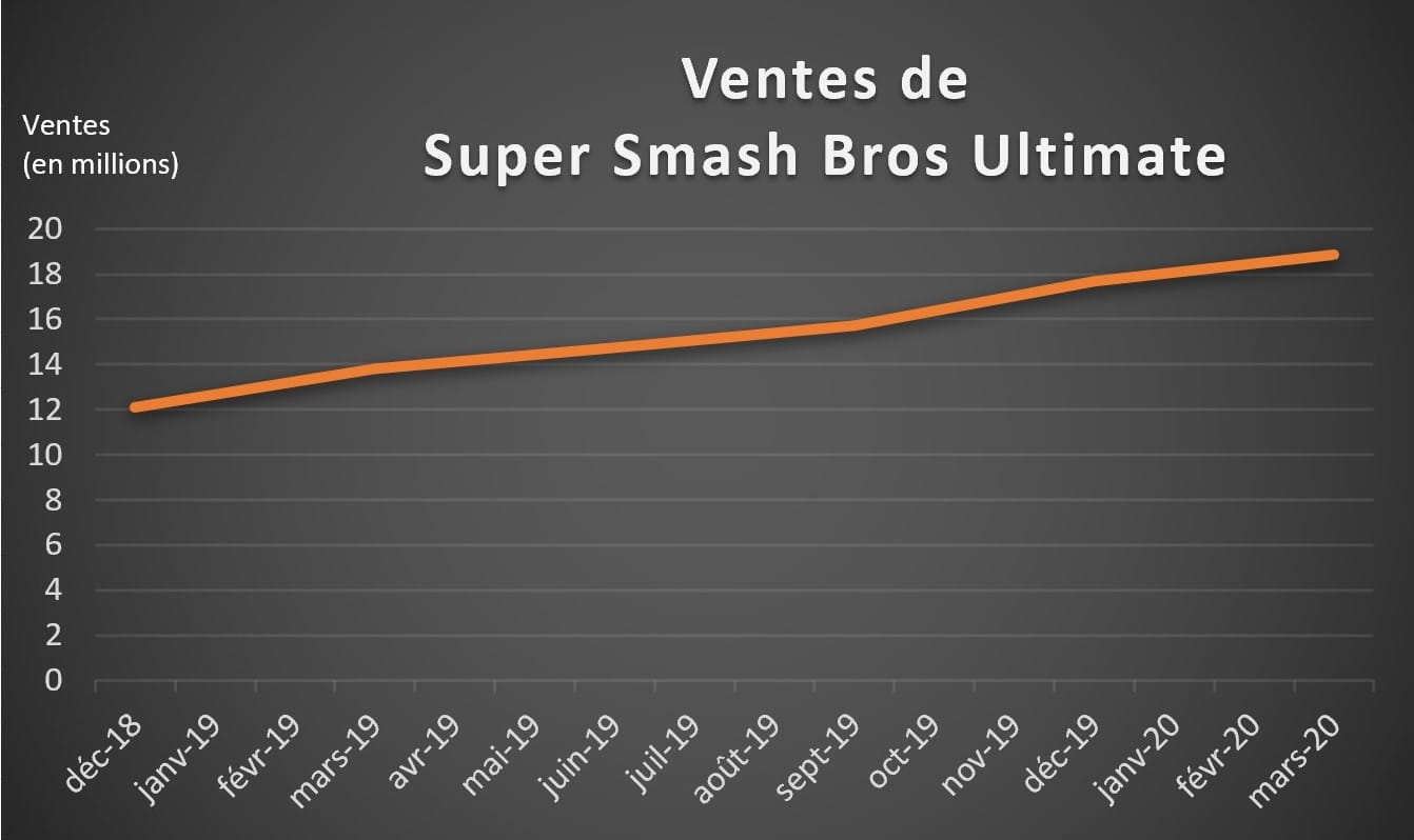 - Après le jeu de course, on retrouve évidemment le jeu de combat : Super Smash Bros. Ultimate est le deuxième jeu le plus vendu de la machine avec 18,84 millions d’exemplaires. Pas grand-chose a ajouter sur le jeu le plus vendu de la série Super Smash Bros. sinon qu’il s’est encore écoulé plus d’un millions de cartouches lors du dernier trimestre.