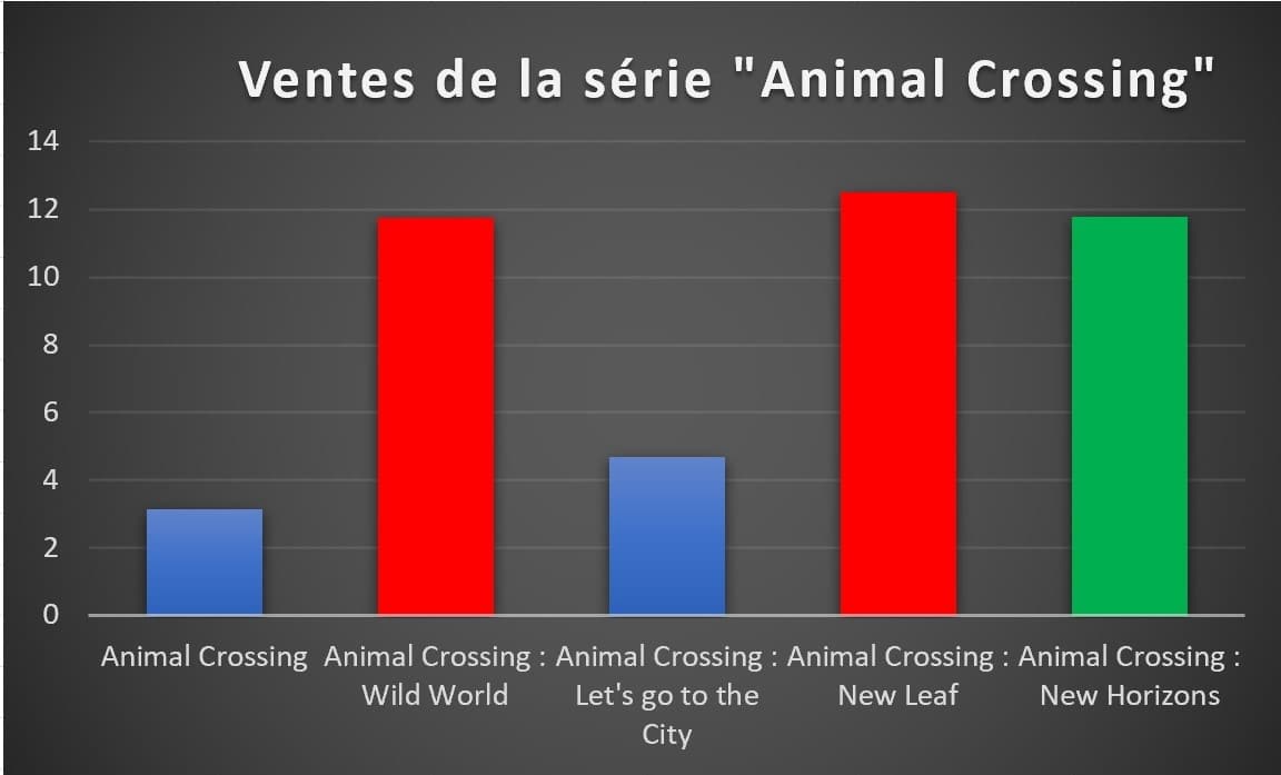 - La dernière sortie en date, Animal Crossing: New Horizons, réalise un véritable carton. C’est ni plus ni moins que 11,77 millions d’exemplaires du jeu qui ont trouvés preneur en l’espace de 11 jours seulement. De plus, les chiffres à l’heure actuelle s’élèvent à 13,41 millions, faisant de ce titre, vous l’aurez deviné, le plus vendu de la série Animal Crossing. Une véritable prouesse en si peu de temps.