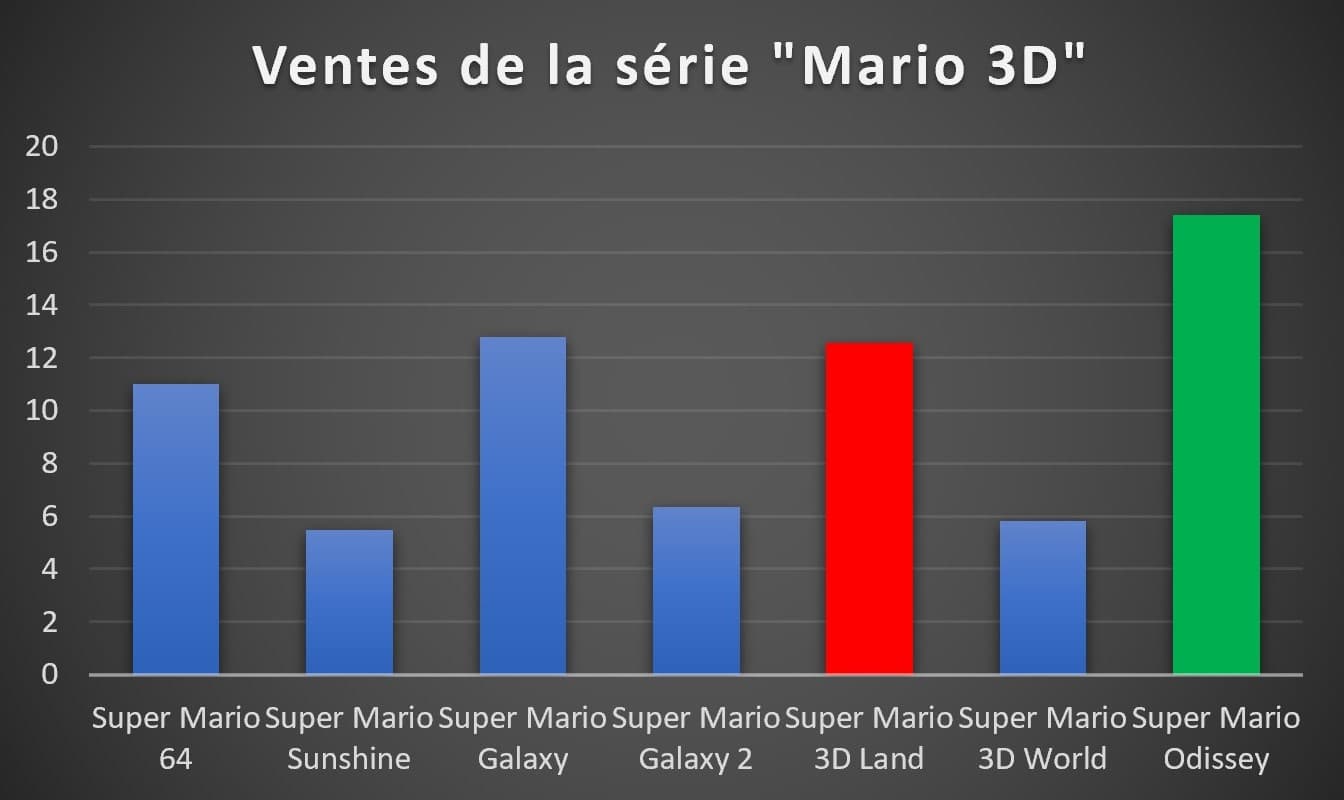 - Juste derrière, on retrouve donc Super Mario Odyssey, Mario 3D le plus vendu de l’histoire. Les ventes de ce dernier s’élèvent aujourd’hui à 17 410 000 exemplaires grâce à 820 000 jeux écoulés en plus lors du dernier trimestre.