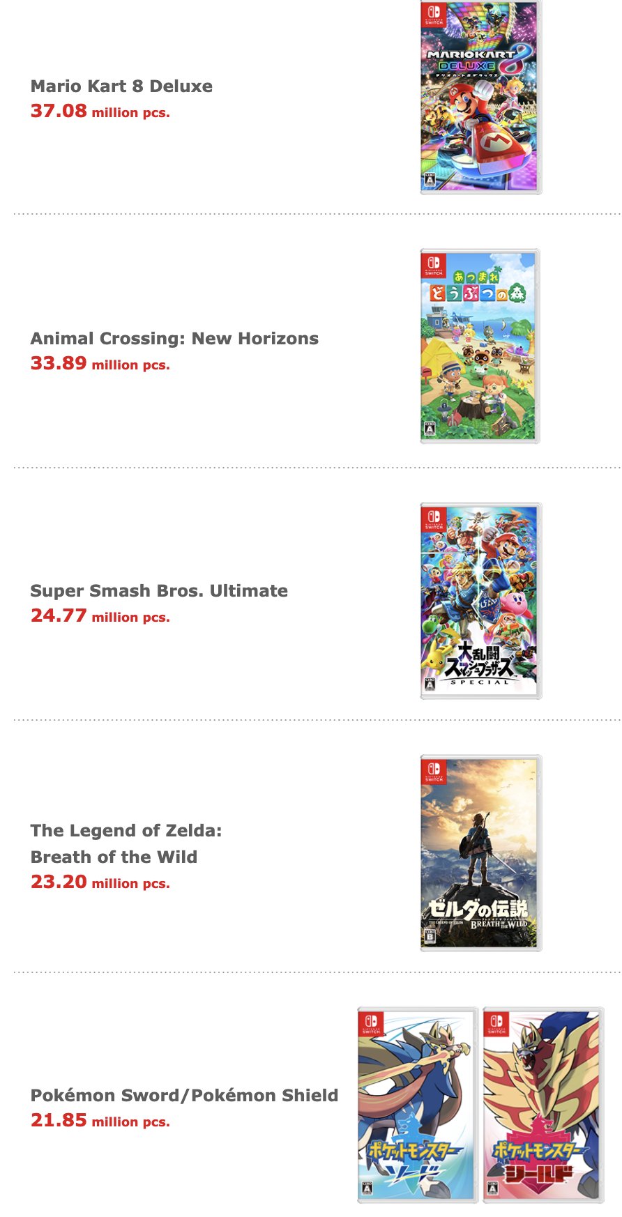 Après de nombreuses années sans changement, le top 10 des ventes de jeux de la Nintendo Switch subit une légère modification avec la sortie de New Super Mario Bros. U Deluxe au profit du fameux Ring Fit Adventure (dont nous avons interviewé un recordman). Dans le reste du classement, Mario Kart 8 Deluxe garde et accroît son avance avec 1.69 million de jeux vendus sur ce premier trimestre, pour un total de 37.08 millions. Le titre de course phare de la firme nippone est à quelques centaines de milliers d’exemplaires de devenir le titre Nintendo le plus vendu de tous les temps (hors bundle tel que Wii Sport ou Super Mario Bros). Animal Crossing: New Horizons dépasse lui aussi le million sur ce trimestre en écoulant encore 1.26 million de ventes, pour 33.89 millions au total.