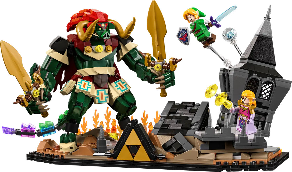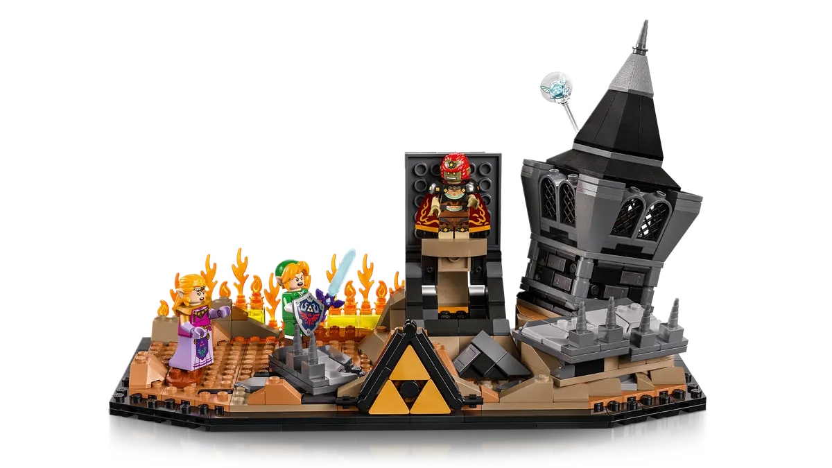 Dans ce diorama particulièrement détaillé, LEGO recrée le château en ruines de Ganon, avec sa tour partiellement détruite et de nombreux éléments interactifs directement inspirés du jeu. Plusieurs fonctionnalités viennent enrichir l’ensemble, comme des décombres mobiles, des cœurs de vie dissimulés dans le décor ou encore un bouton permettant de faire surgir Ganondorf des ruines, rappelant la mise en scène du combat final.