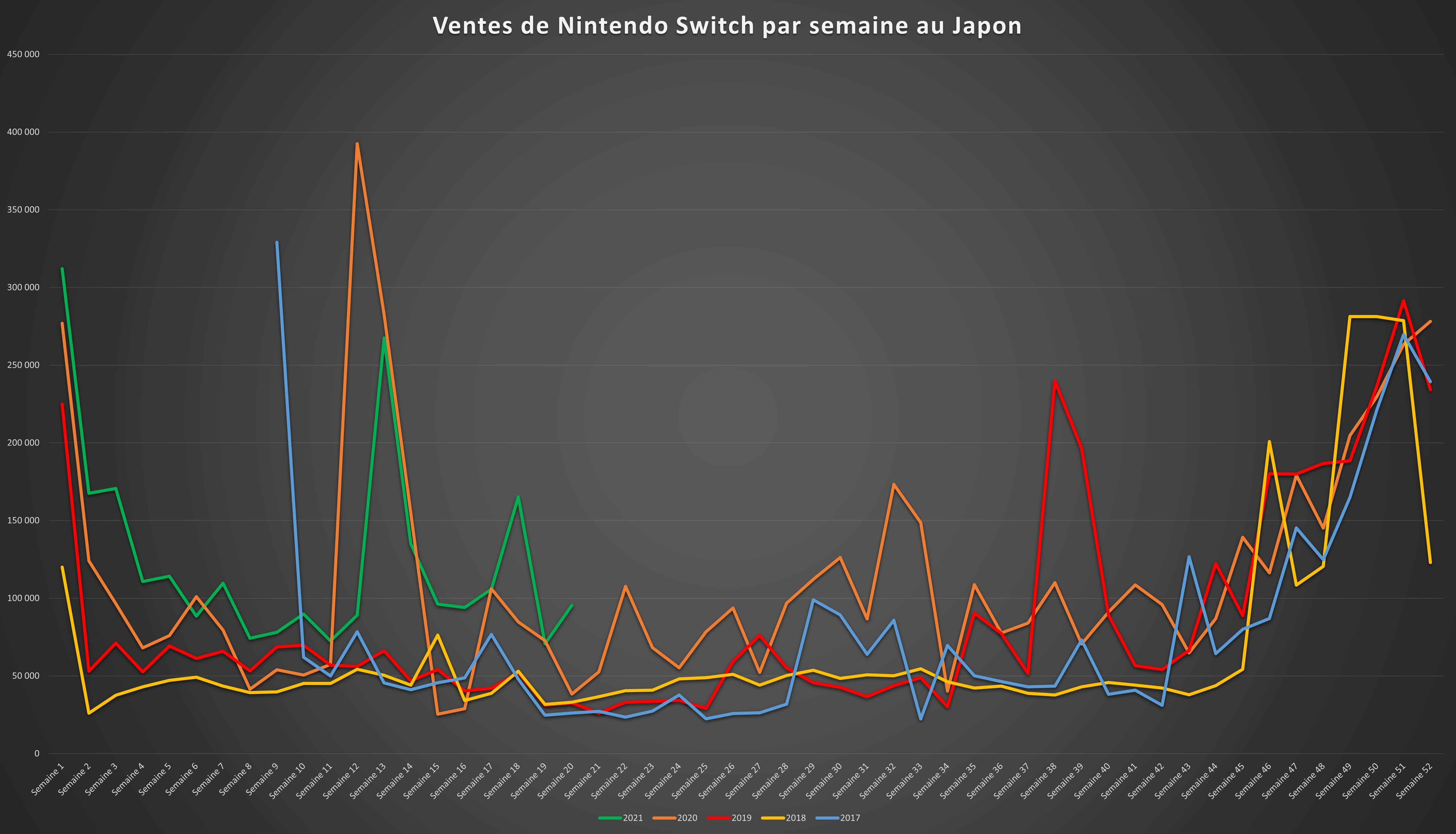 Malgré une semaine calme en nouveau jeu et sortie de Golden Week, les ventes de Nintendo Switch restent à une valeur très élevée avec pas loin de 100 000 machines vendues dans le pays. Le modèle classique conserve quant à lui l’avantage sur la version uniquement portable. Les ventes de PS5 rechutent à une valeur relativement basse en dessous de la barre des 15 000 ventes suite aux problèmes de stocks toujours présents.
