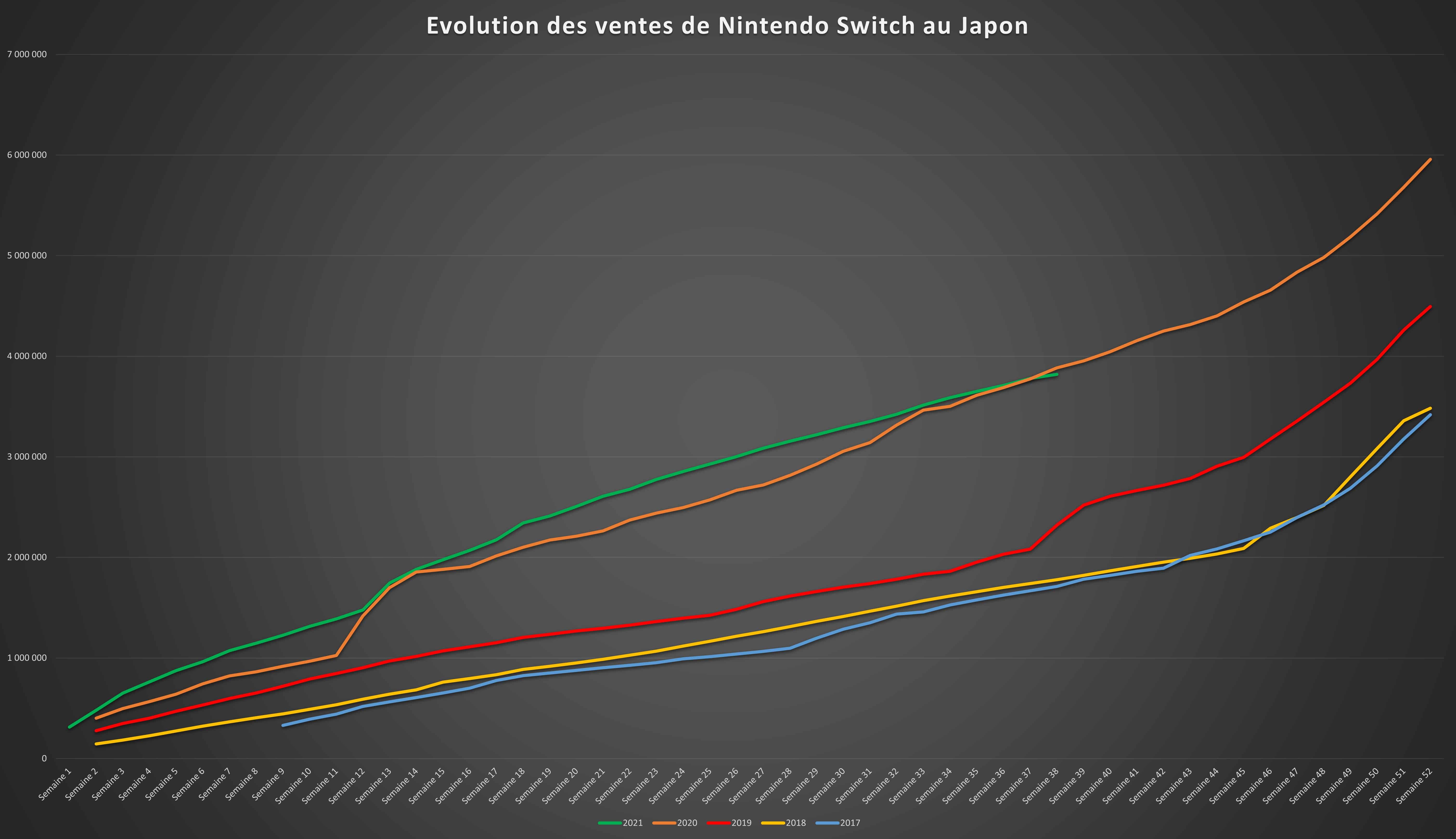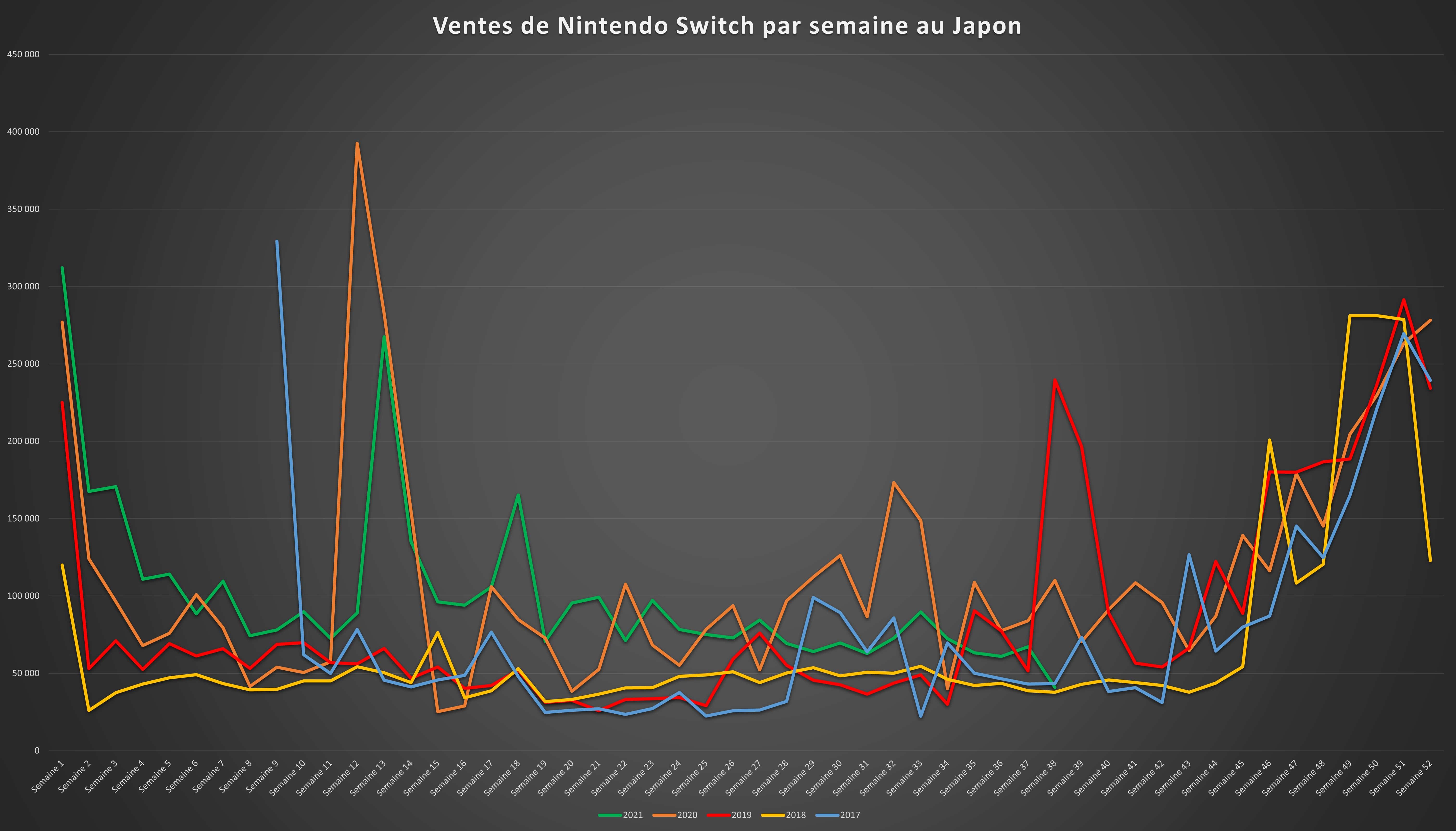 La Nintendo Switch réalise sa pire semaine de l’année avec 40 000 machines vendues. La courbe de ventes de l’année 2021 passe officiellement sous celle de l’année 2020. La sortie de la Nintendo Switch OLED étant prévue pour le 8 octobre, il faudra attendre encore quelques semaines pour voir les ventes de la console repartir à la hausse.