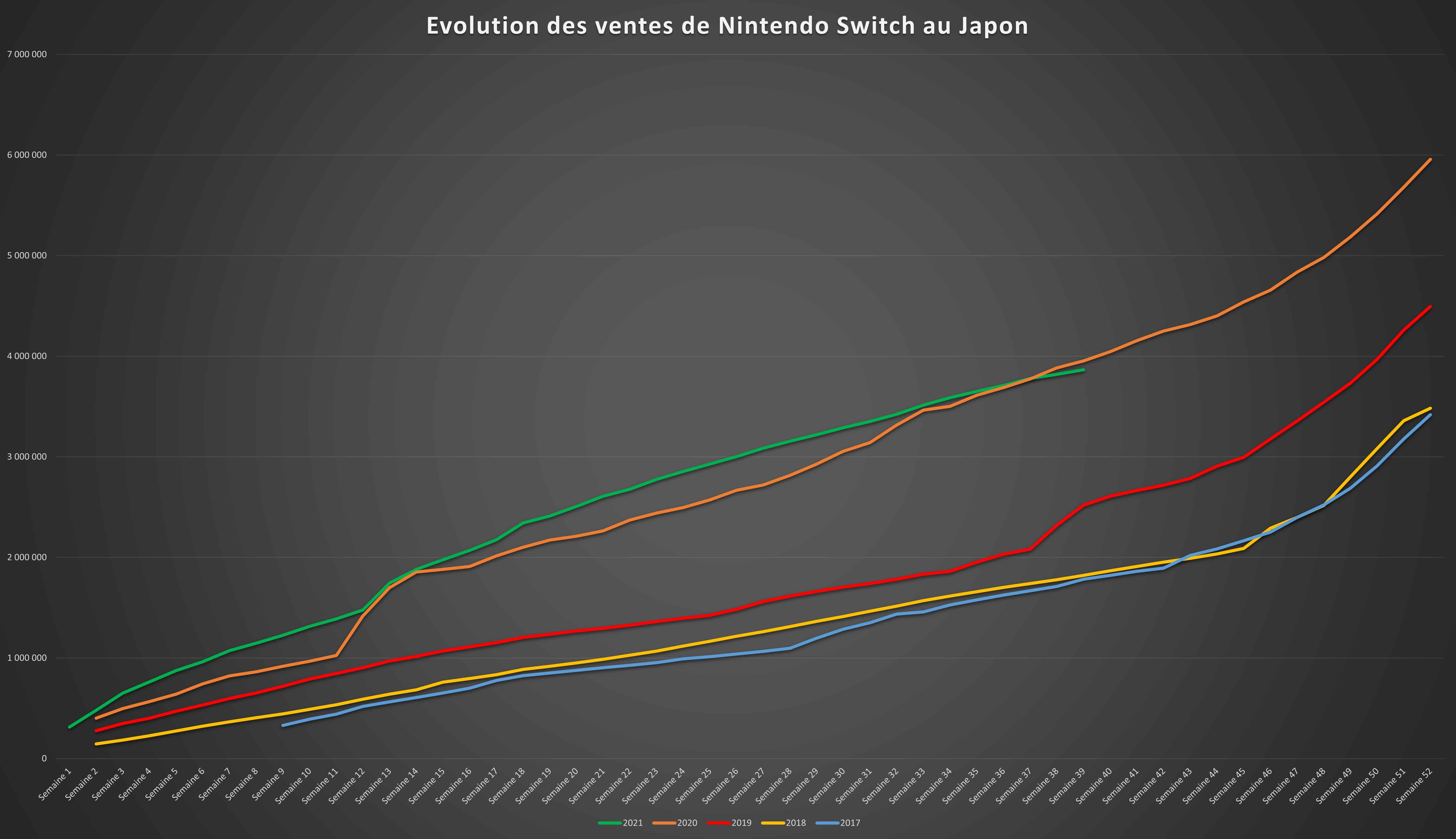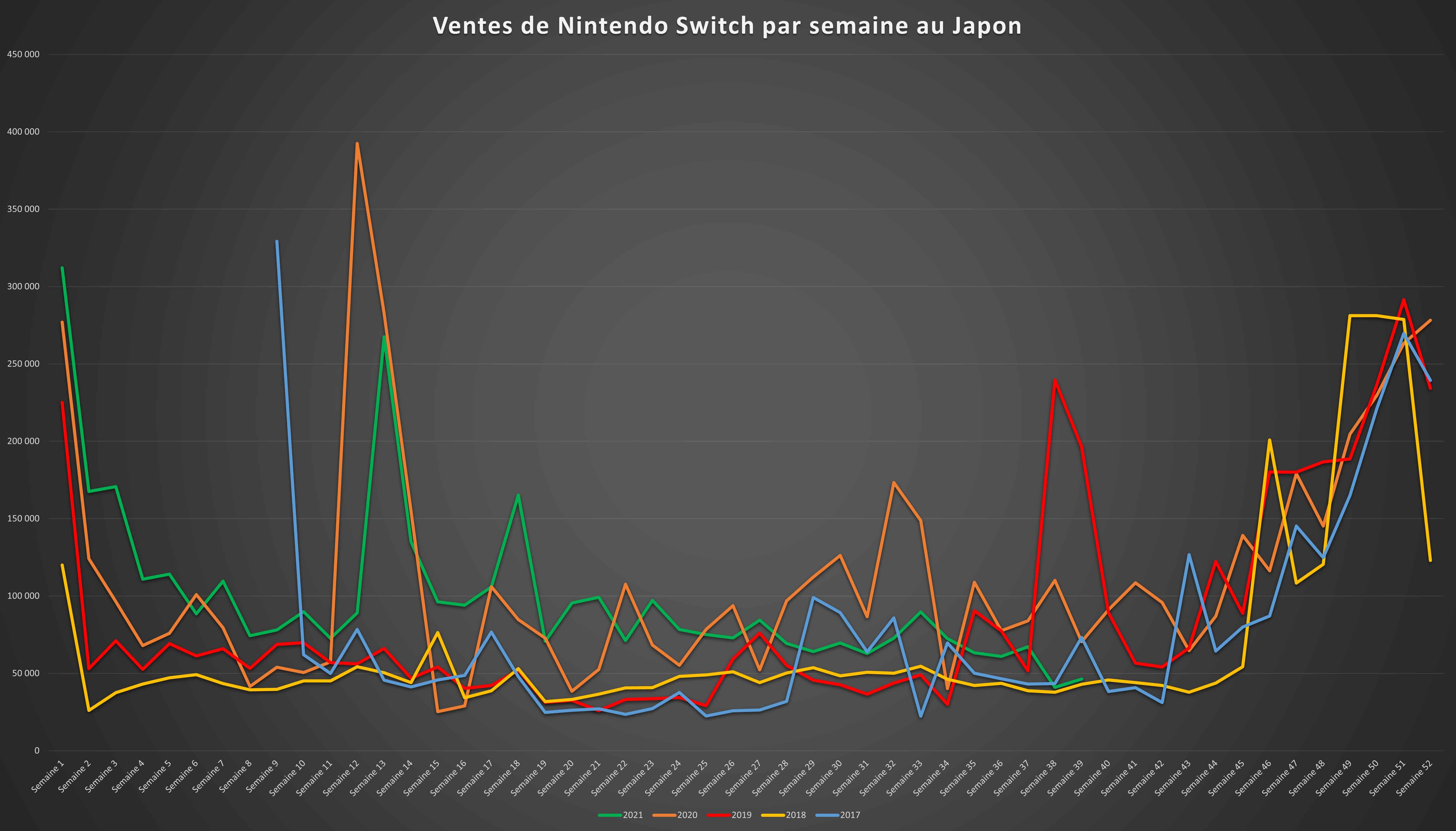 Comme indiqué en introduction, les ventes de la Nintendo Switch restent relativement faibles en attente du modèle OLED avec moins de 50 000 machines écoulées. La courbe de ventes de 2021 passe cette fois bien en-dessous de celle de 2020, il faudra voir l’importance du modèle OLED sur les fêtes de fin d’année pour savoir si la console peut réaliser une meilleure année que 2020.