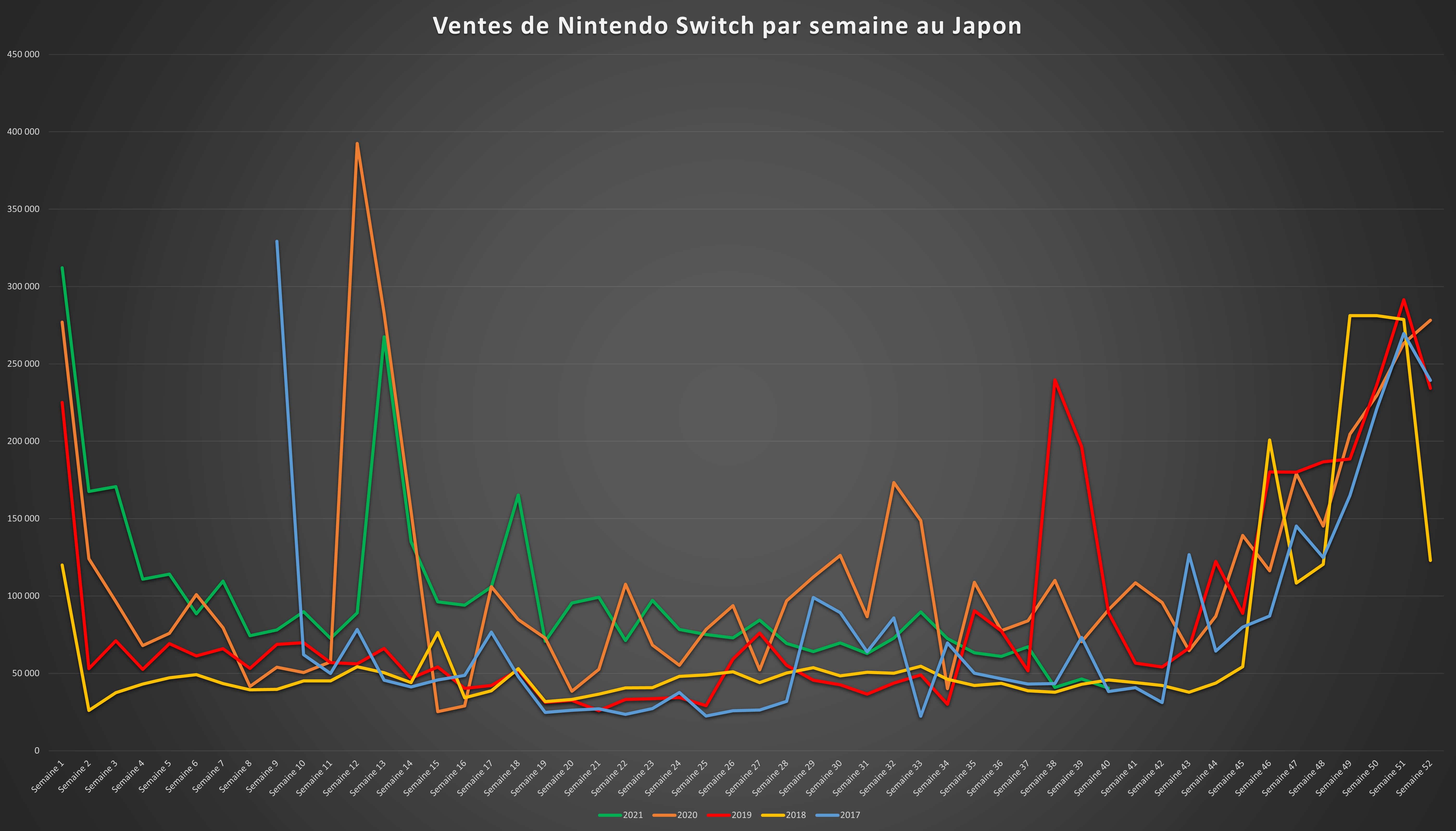 Du côté des ventes de consoles, c’est le grand calme : l’ensemble des machines enregistre des ventes très faibles. La Nintendo Switch se situe une nouvelle fois autour des 40 000 consoles écoulées, sans doute pour la dernière semaine avant l’arrivée du nouveau modèle et de l’ensemble des grosses cartouches de la fin de l’année.