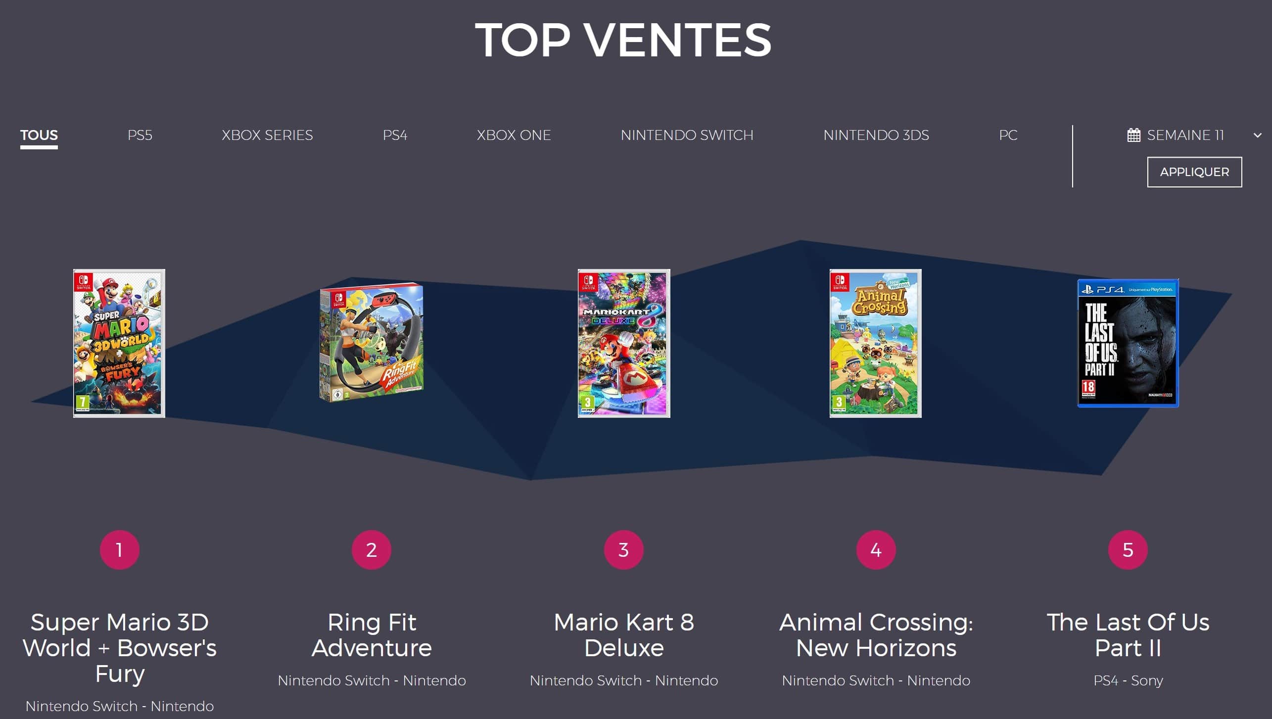 Lors de la semaine 11, rien de particulier n’est à remarquer concernant la Nintendo Switch. Cette dernière occupe une nouvelle fois les quatre premières places du classement du top des ventes de jeux en France avec notamment Super Mario 3D World + Bowser’s Fury en tête. Il est suivi par les éternels Ring Fit Adventure, Mario Kart 8 Deluxe et Animal Crossing: New Horizons. La dernière place est occupée, par surprise, par The Last of Us Part. II sur PS4, de retour après presque un an d’absence. Ce retour s’explique par les nombreuses publicités et promotions proposées par Sony.