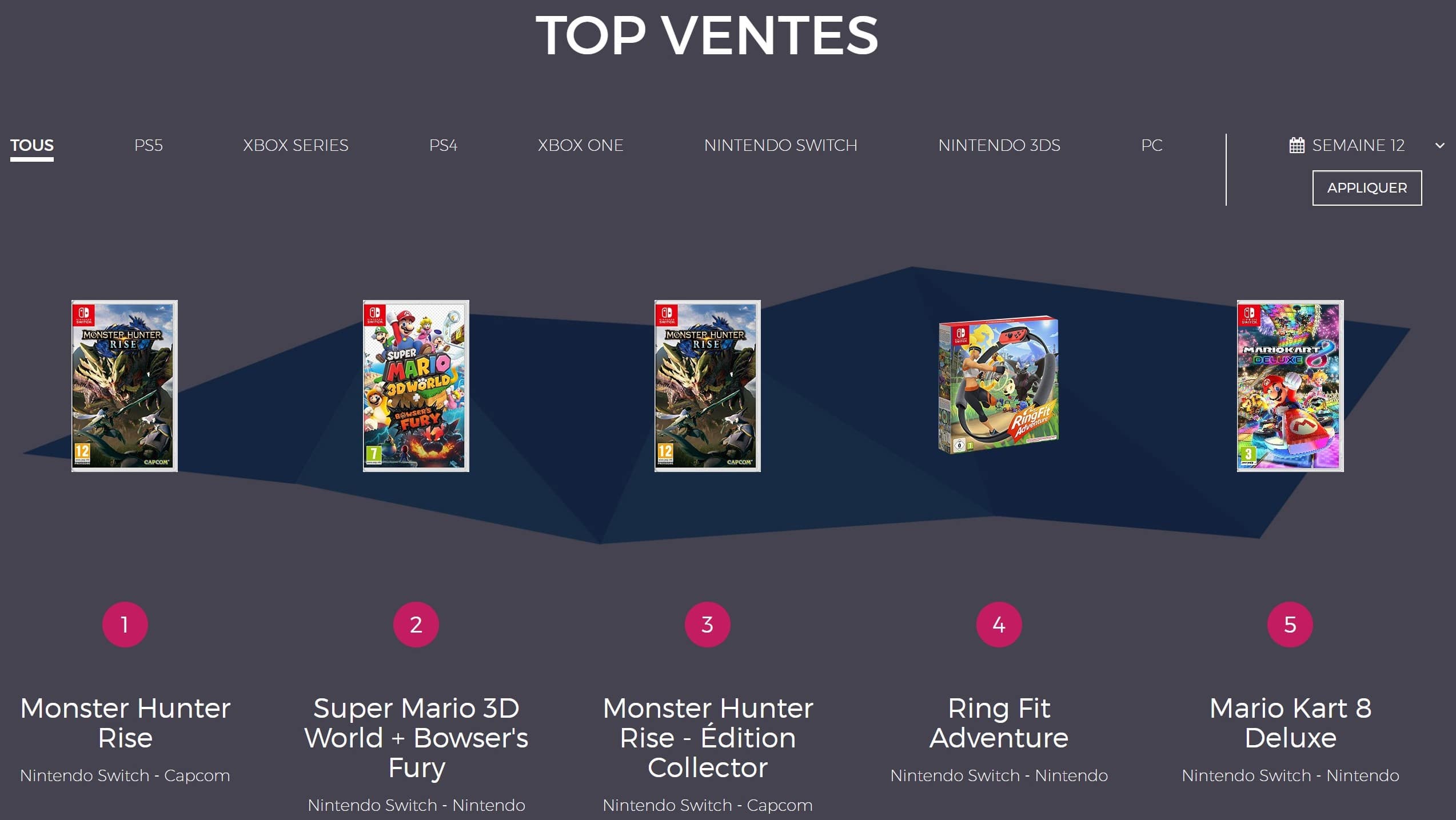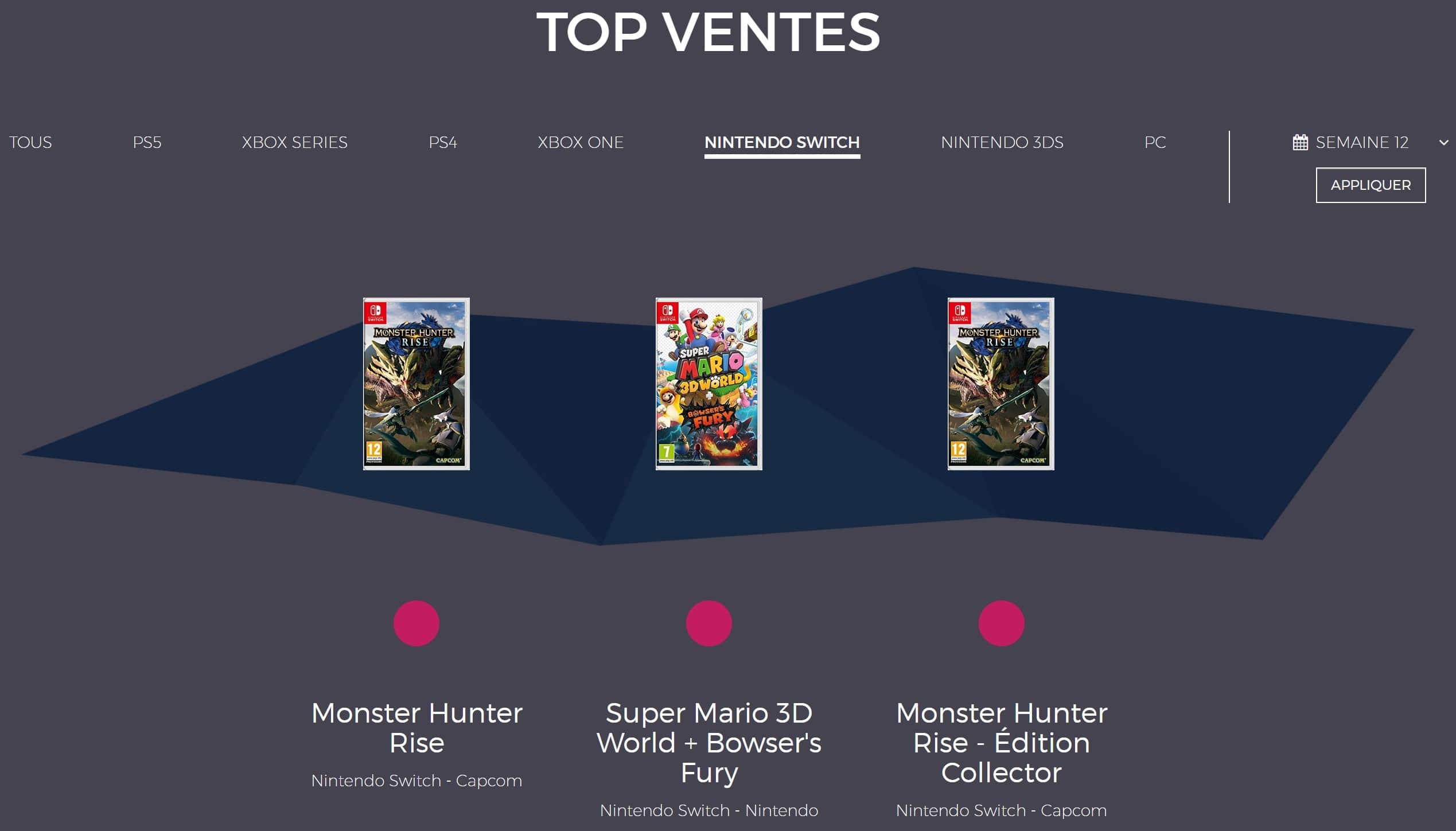 Les classements exclusifs à la Nintendo Switch s’avèrent peu généreux en informations puisqu’on retrouve les mêmes jeux que dans les classements généraux. Super Mario 3D World + Bowser’s Fury, Ring Fit Adventure et Mario Kart 8 Deluxe occupent le top de la semaine 11 tandis que seul le portage du Mario 3D de la Wii U s’intercale entre les deux versions de Monster Hunter Rise lors de la semaine 12.