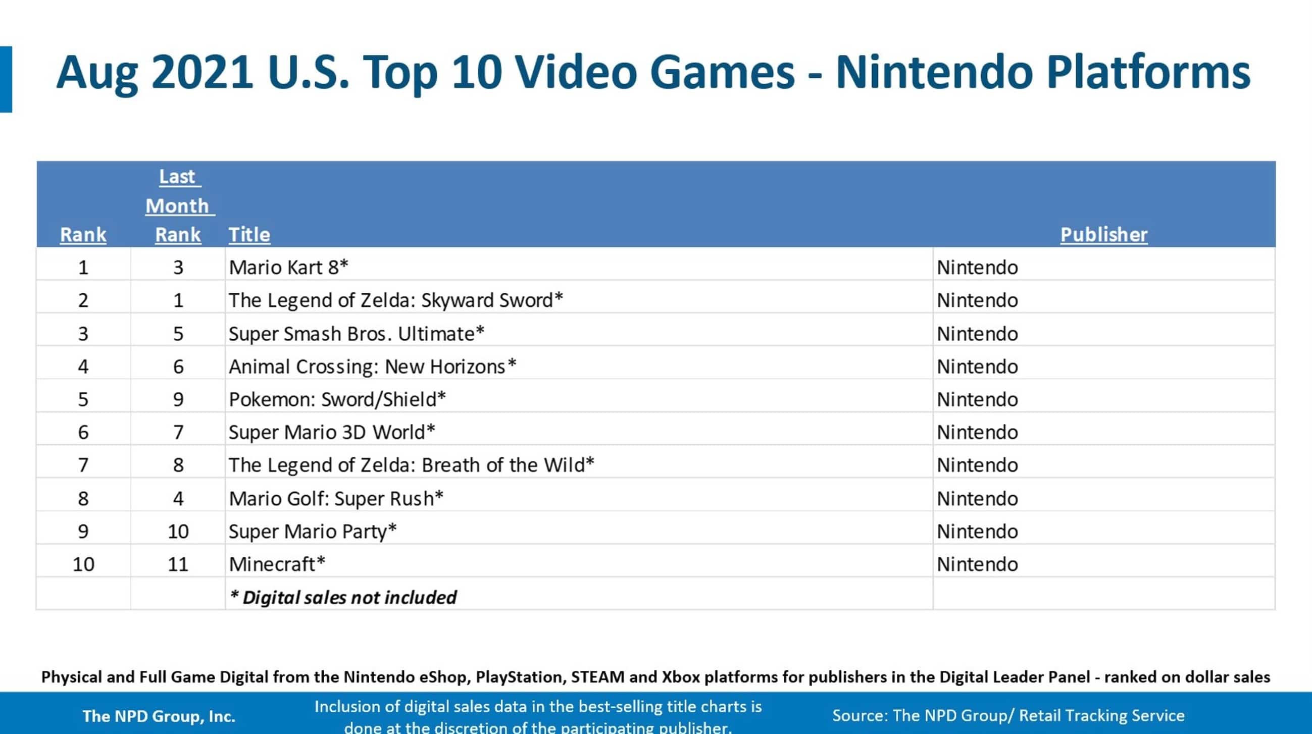 La licence de sport d’Electronic Arts s’impose dans le classement, suivie par Ghost of Tsushima, bien boosté par la sortie de sa Director’s Cut. Nintendo place une nouvelle fois neuf exclusivités dans le top 20 alors même que les données concernant les ventes du Nintendo eShop ne sont pas comptabilisées. Mario Kart 8 Deluxe continue de montrer la voie pour les autres titres made in Nintendo suivi par The Legend of Zelda: Skyword Sword HD. Le titre accompagnant la sortie de la machine en 2017 reste une nouvelle fois présent dans le top des ventes de jeux en août.