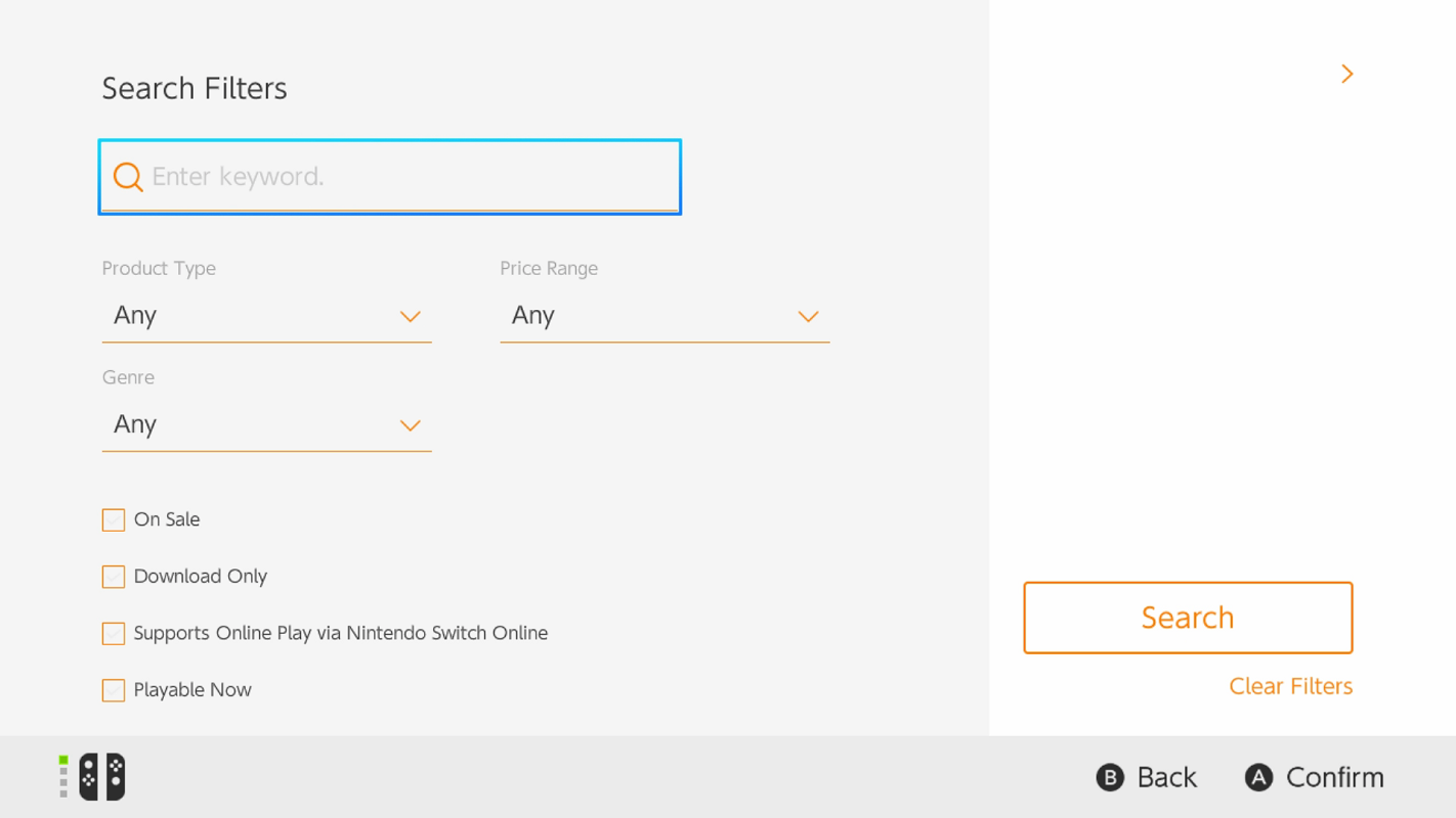 Mots clés, Type de contenu (logiciel [ndlr: jeux], contenu additionnel, logiciels avec démo), Prix (30,00€ et plus, de 10,00€ à 29,99€ et de 0,01€ à 9,99€), Genre (une liste de 26 filtres dont par exemple » Musique « , » Combat » ou encore » Outil système » que nous avons du mal à cerner pour le moment), ainsi que plusieurs cases à cocher : » En promotion « , » Uniquement en téléchargement « , » Jouable en ligne via Nintendo Switch Online » et pour finir, » Déjà disponible « . Ne manque plus qu’un filtre qui pourrait s’avérer très utile, celui permettant de trouver rapidement les jeux en free to play.