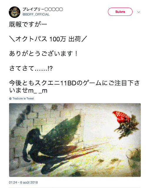 « Nous l’avons déjà annoncé mais 1 million d’Octopath Traveler ont été vendus ! Merci à vous ! Mais maintenant… Préparez-vous pour le prochain jeu Bravely Default ! »