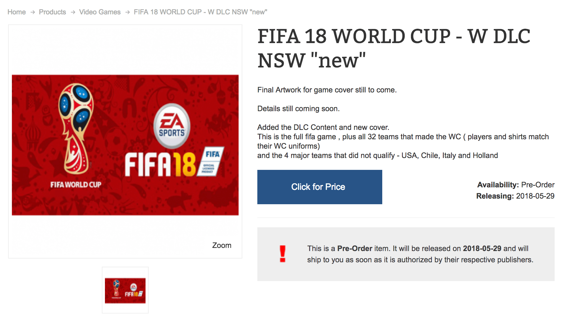 Mais tout cela semble concerner également la Nintendo Switch, d’après le distributeur américain US-1 qui a listé une version physique de FIFA 18 basée sur la Coupe du Monde. Il est précisé dans la fiche que le jeu comprendra le DLC Coupe du Monde 2018. Il est donc supposé que le DLC sera également offert aux actuels possesseurs de FIFA 18 sur Switch comme sur le PSN.