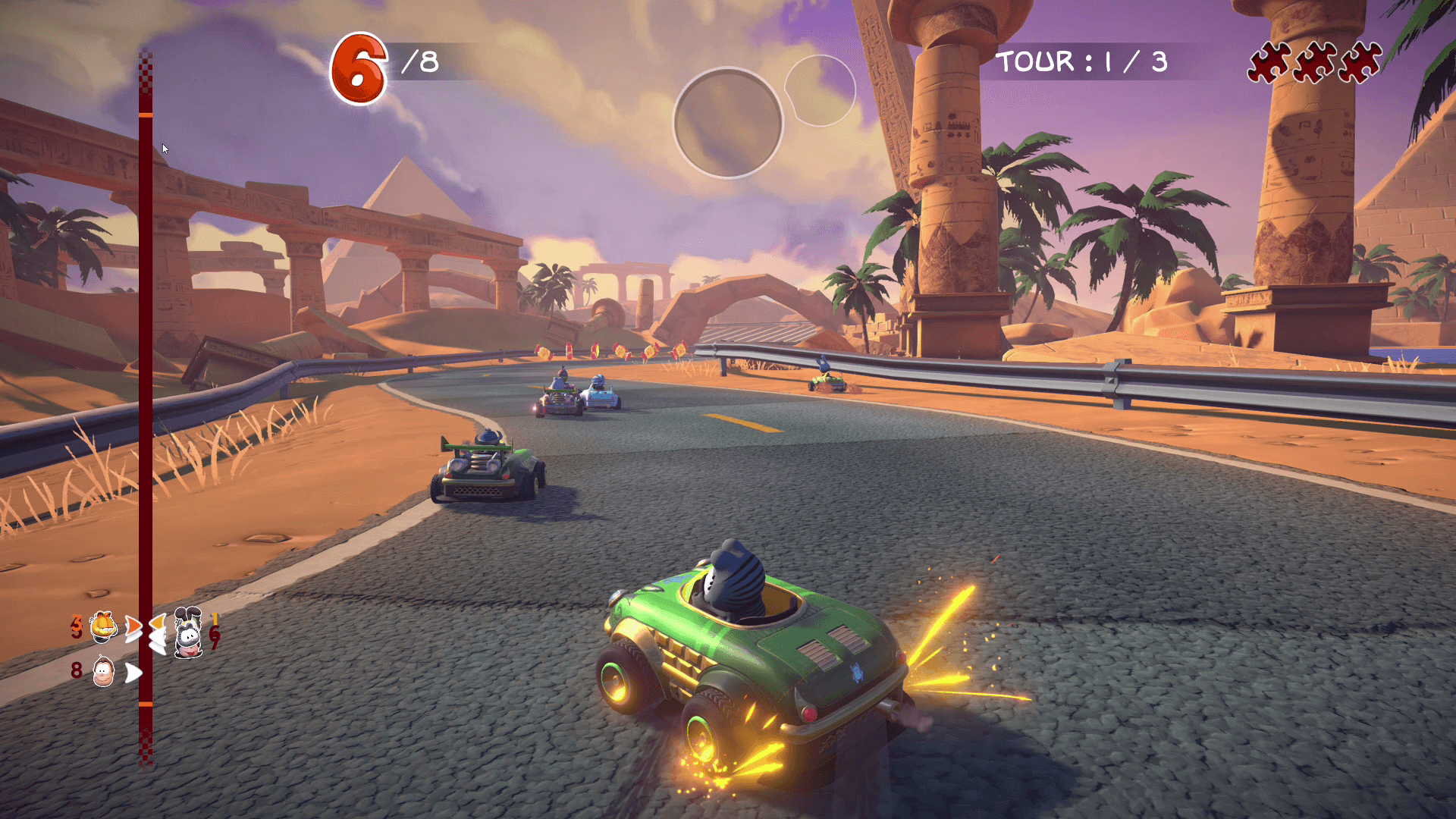 Le jeuGarfield Kart Furious Racing proposera pas moins de 16 circuits emblématiques de l’univers du chat roux, comme le Lac Rochepales ou l’Usine Pastacosi, le tout au sein de trois modes de jeux : Championnat, Course libre et COntrole la montre. Jusqu’à huit joueurs pourront s’affronter en ligne et jusqu’à quatre en local écran splitté. Pour celles et ceux qui ont sept amis disposant d’une Nintendo Switch et du jeu, vous pourrez jouer chacun sur votre console à huit en multijoueur local sans-fil.