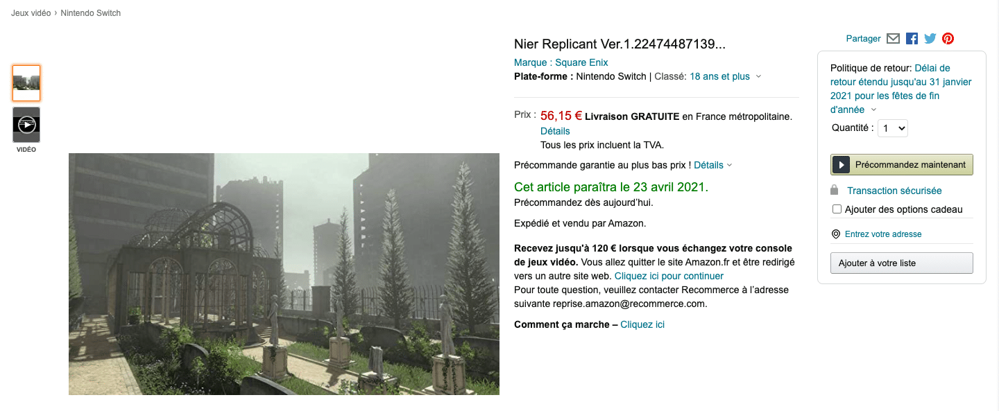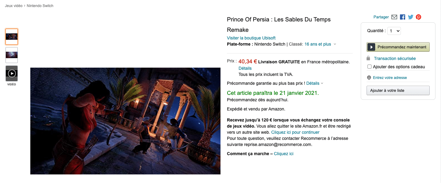 Mais là où le bât blesse, c’est sur le fait que cette information sorte tout droit d’Amazon France. S’il arrive géant Américain de leak des jeux qui se voient être officialisés par la suite, la branche Française n’a pas toujours été la meilleure dans ce domaine, certains joueurs attendant toujours Super Mario Odyssey sur PC. Ce n’est pour autant pas une cause totalement perdue pour les titres de Square Enix et Ubisoft, puisque des rumeurs concernant Prince of Persia sur Switch avaient déjà été traitées plus tôt dans l’année et laisseraient entendre que le titre sortira « plus tard » sur la machine de Nintendo.