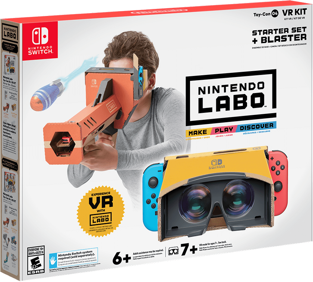 Ce kit propose six nouveaux Toy-Con (pour rappel, il s’agit du nom donné à chaque « jouet » du Nintendo Labo) à construire, divisés en plusieurs packs. Le premier, proposé à 39,99$, comprendra deux Toy-Con : les lunettes VR qui se combinent aux autres créations pour permettre aux joueurs d’interagir dans un monde virtuel grâce à des actions réelles, comme (ceci est un simple exemple) plonger dans un court métrage dans lequel nous sommes le héros ou ce genre de contenu habituel – mais efficace – du monde VR ; le second est un blaster qui nous embarquera dans une invasion extraterrestre, qu’il faudra évidemment repousser.