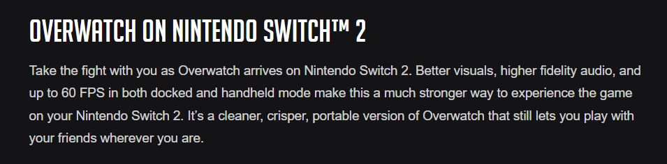 D’après ce que je peux en dire, la mise à jour d’Overwatch a amélioré les graphismes & ajouté des assets pour les versions Switch 1 et Switch 2, mais la version Switch 2 n’a pas les 60 FPS comme promis. Les deux tournent à 30 FPS.