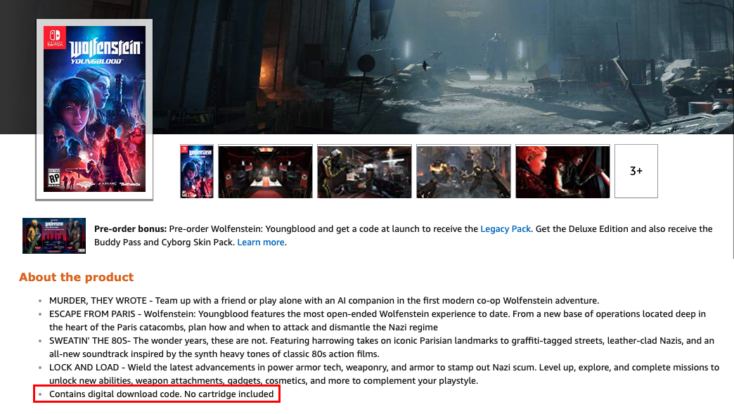 C’est assez incompréhensible et même incroyable, cette annonce va sans doute faire râler beaucoup de gens tout en affectant directement les ventes du jeu. D’après le site Amazon.com, la version Nintendo Switch de Wolfenstein: Youngblood ne comporterait purement et simplement pas de cartouche, mais uniquement un code de téléchargement à entrer sur l’eShop. À l’instar de ce qui peut se faire sur PC donc, vous pourrez tout à fait acheter le jeu physiquement chez votre revendeur préféré, mais n’espérez pas disposer de cette petite carte si chère aux joueurs Nintendo. Nous ne savons pas encore, pour l’heure, si la version Européenne subira le même sort, mais il y a fort à parier que … oui.