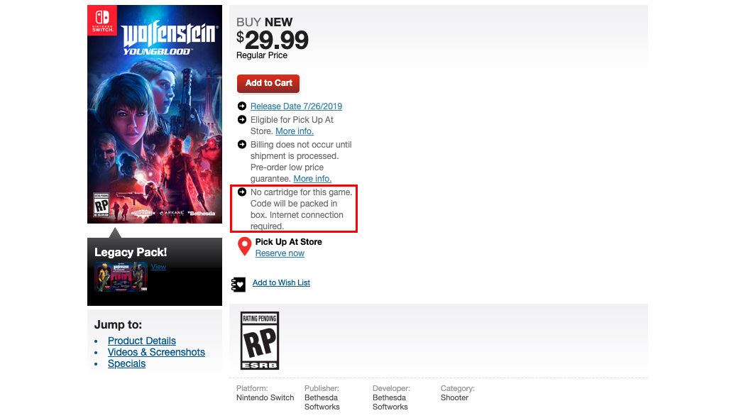 La version pour Nintendo Switch de Wolfenstein: Youngblood sera disponible de manière dématérialisée. La version physique de Wolfenstein: Youngblood correspondra à un boîtier contenant un code de téléchargement numérique, mais pas de cartouche. Vous devrez télécharger le jeu pour y jouer.