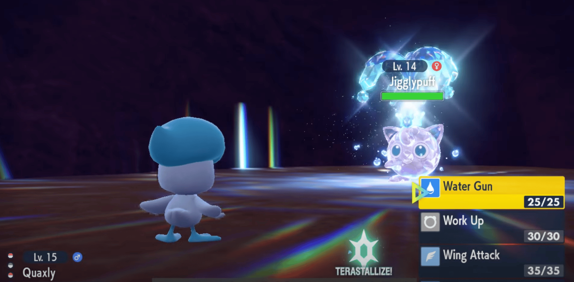 Gimmick signature de cette nouvelle génération, la Téracristallisation sera à Pokémon Écarlate & Violet ce que le Dynamax était à Pokémon Épée & Bouclier. Si les joueurs sont déjà au courant du principe de cette nouvelle mécanique de gameplay, la bande-annonce nous apprend que certains Pokémon sauvages seront du genre à y recourir dès le début d’un combat. Ces Pokémon spéciaux seront immédiatement reconnaissables à l’aura dorée qui les entourent et il semble clair que leur Téracristallisation leur donneront un type différent. Le trailer illustre ceci par un combat contre un Rondoudou sauvage qui passe du double type Normal/Fée au type Eau.