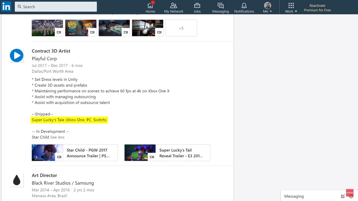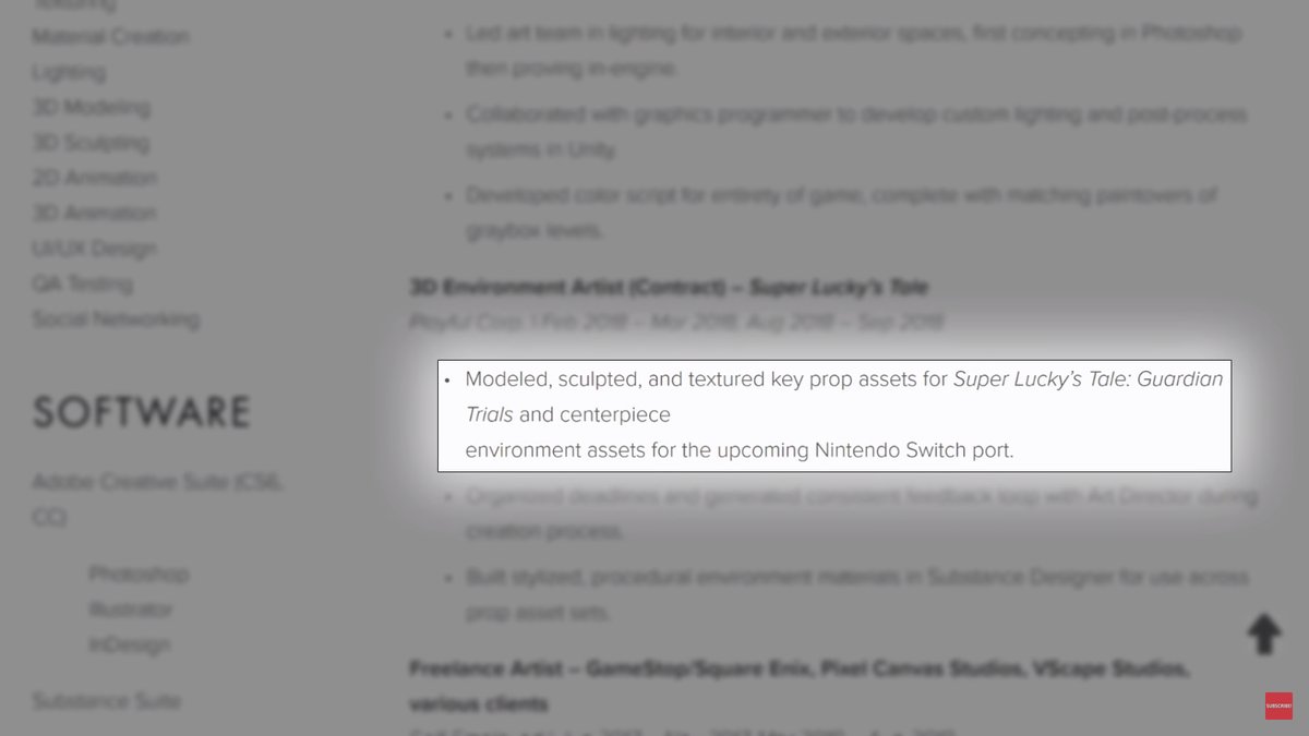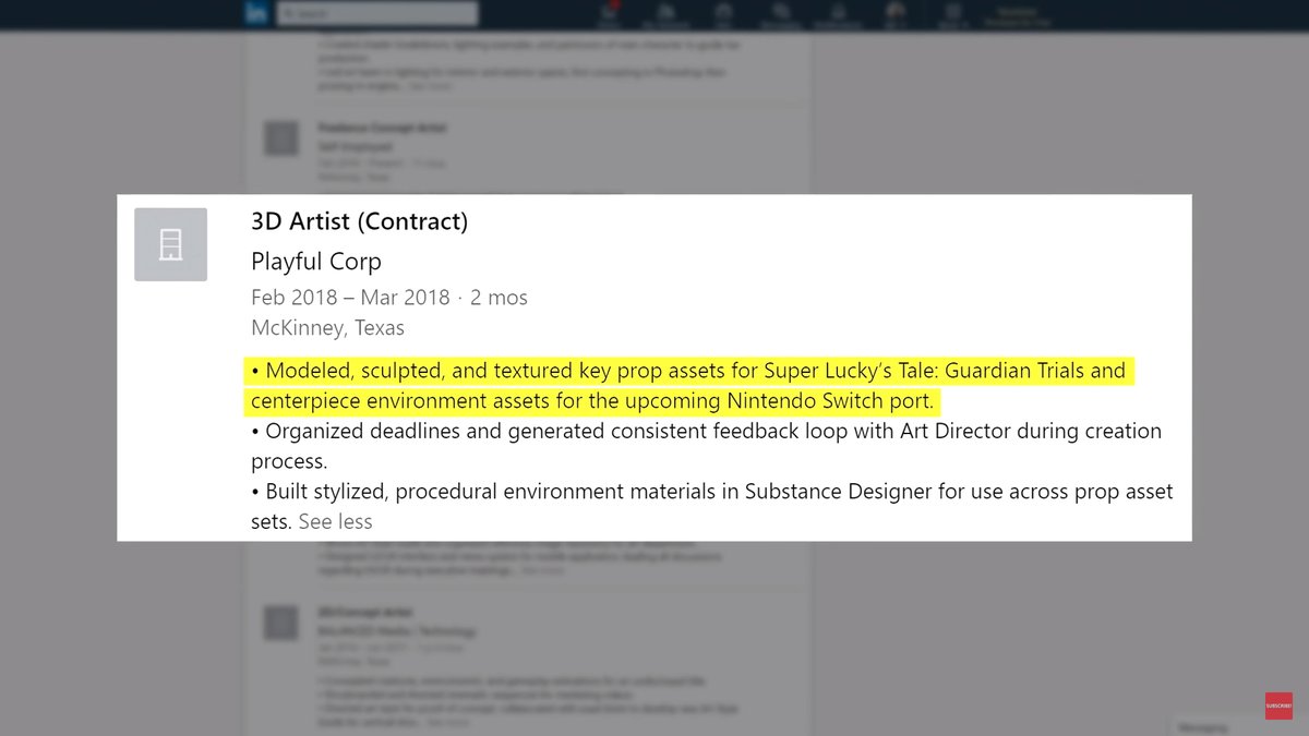 Récemment, le site NintendoEverything est tombé sur une information pour le moins étonnante. Jusqu’ici cantonné à ses plateformes Microsoft, le jeu Super Lucky’s Tale pourrait finalement sortir sur NintendoSwitch, à notre grand bonheur. L’artiste-concepteur Taylor Smith de chez PlayfulCorp, studio indépendant à l’origine du jeu, aurait fait mention de la Switch dans son CV. Il y est dit que le monsieur aurait travaillé sur les » Éléments environnementaux du prochain port sur console Nintendo Switch « . Ce n’est pas le seul puisque Jesse Sosa (qui a travaillé chez Playful Corp jusqu’à fin 2017) avait déjà déclaré sur son profil LinkedIn qu’il avait travaillé sur le jeu Super Lucky’s Tale pour Nintendo Switch bien que cela commence maintenant à dater légèrement.