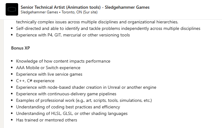 Et si Call of Duty arrivait enfin sur Nintendo Switch (et/ou Switch 2) ? Bientôt 3 ans après avoir signé un contrat engageant Microsoft à porter la licence Call of Duty sur consoles Nintendo, une offre d’emploi publiée par Sledgehammer pourrait nous faire penser que le géant américain ait enfin décidé d’avoir une parole. L’information nous vient directement d’une offre d’emploi publiée sur LinkedIn par Sledgehammer Games, l’un des studios derrière les jeux Call of Duty comme les épisodes Modern Warfare III et Advanced Warfare par exemple. Le poste, situé à Toronto, concerne un Senior Technical Artist. Si la majorité des prérequis sont classiques pour ce type de poste (maîtrise de langages de programmation), la section « Bonus XP » a de quoi mettre la puce à l’oreille des fans de Nintendo. Le studio recherche spécifiquement une candidate ou un candidat possédant une « Expérience sur des jeux AAA Mobile ou Switch ».