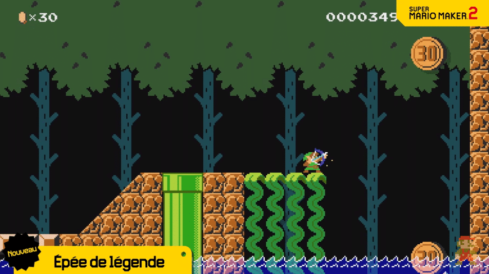 Mais ce n'est pas tout, un objet plutôt inattendu est ajouté à Super Mario Maker 2 : l'épée de légende ! Accessible seulement avec le style Super Mario Bros., Mario pourra se transformer en Link mais contrairement au premier épisode, ce n'est pas seulement un costume : vous aurez la possibilité d'utiliser votre épée, votre bouclier, vos bombes ou encore votre arc pour ainsi créer des possibilités de gameplay encore plus illimitées !