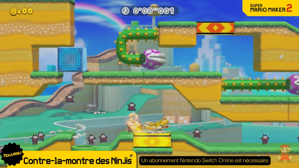 Et enfin, un nouveau mode en ligne, « Le contre-la-montre des Ninjis », sera disponible pour les abonnés au Nintendo Switch Online. Il s'agira là de réaliser le meilleur temps dans des niveaux crées par Nintendo, contre les fantômes des autres joueurs, symbolisés par des Ninjis. Selon vos performances, vous obtiendrez différents costumes pour vos Miis.