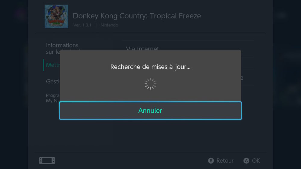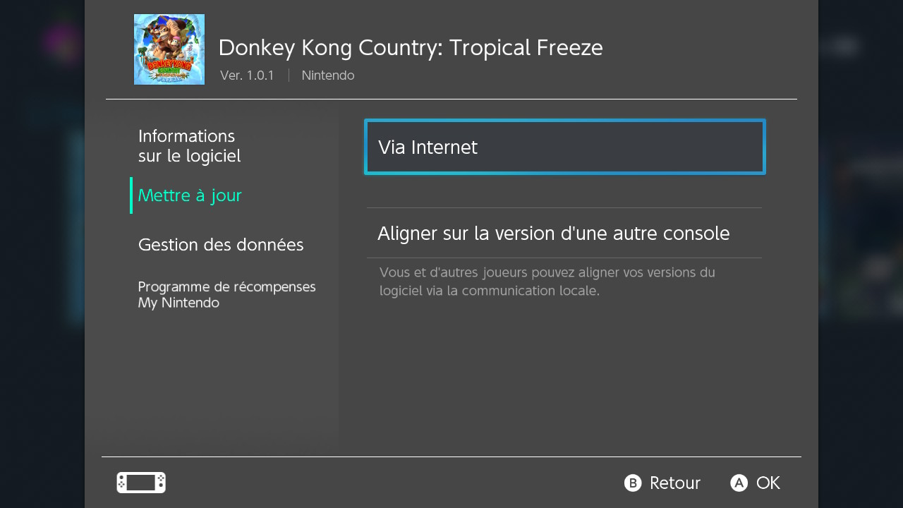 Si la mise à jour n’a pas été téléchargée automatiquement pour votre jeu, voici la marche à suivre. Sur l’écran d’accueil de la Nintendo Switch, placez la sélection sur le jeu concerné. Appuyez ensuite sur la touche » + » de votre manette ou de votre joy-con, puis cliquez sur » Mettre à jour > Via Internet « . Si une mise à jour est disponible, elle vous sera proposée à ce moment.