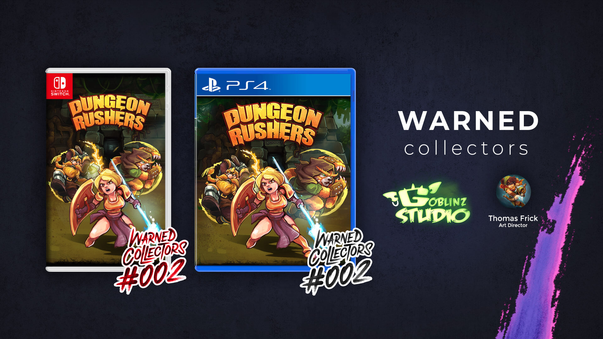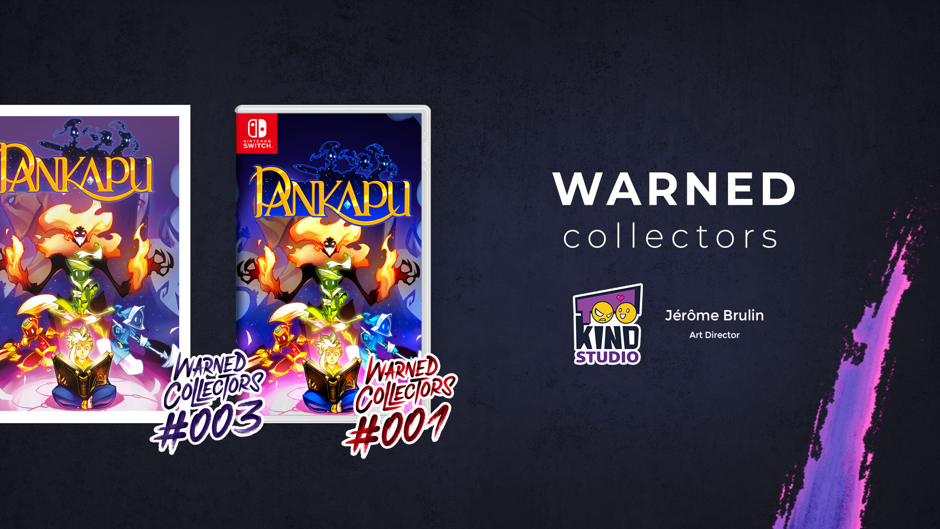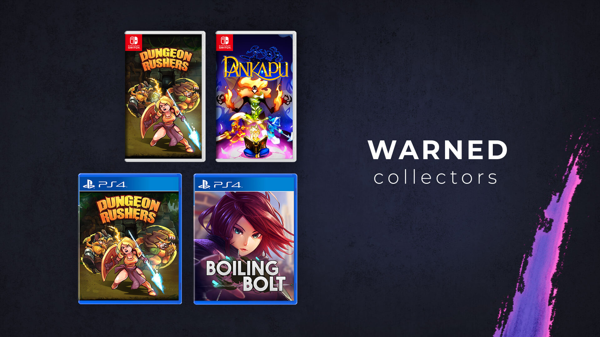 Alors que les jeux indépendants affluent de plus en plus sur Nintendo Switch et se vendent souvent mieux qu’ailleurs, certains joueurs sont déçus de ne pas voir ces titres sortir en version physique. Souhaitant contourner cette affluence de jeux dématérialisés, le studio Warned Collectors a ouvert ses portes le 7 décembre dernier. À l’heure actuelle, la promesse se base sur un line-up 100% français. Les trois premiers jeux édités en version physique sont donc Pankapu (Persistant Studios) sur Nintendo Switch, Dungeon Rushers (Goblinz Studio) sur Nintendo Switch et PlayStation 4, puis Boiling Bolt (Too Kind Studio) uniquement sur la console de Sony.