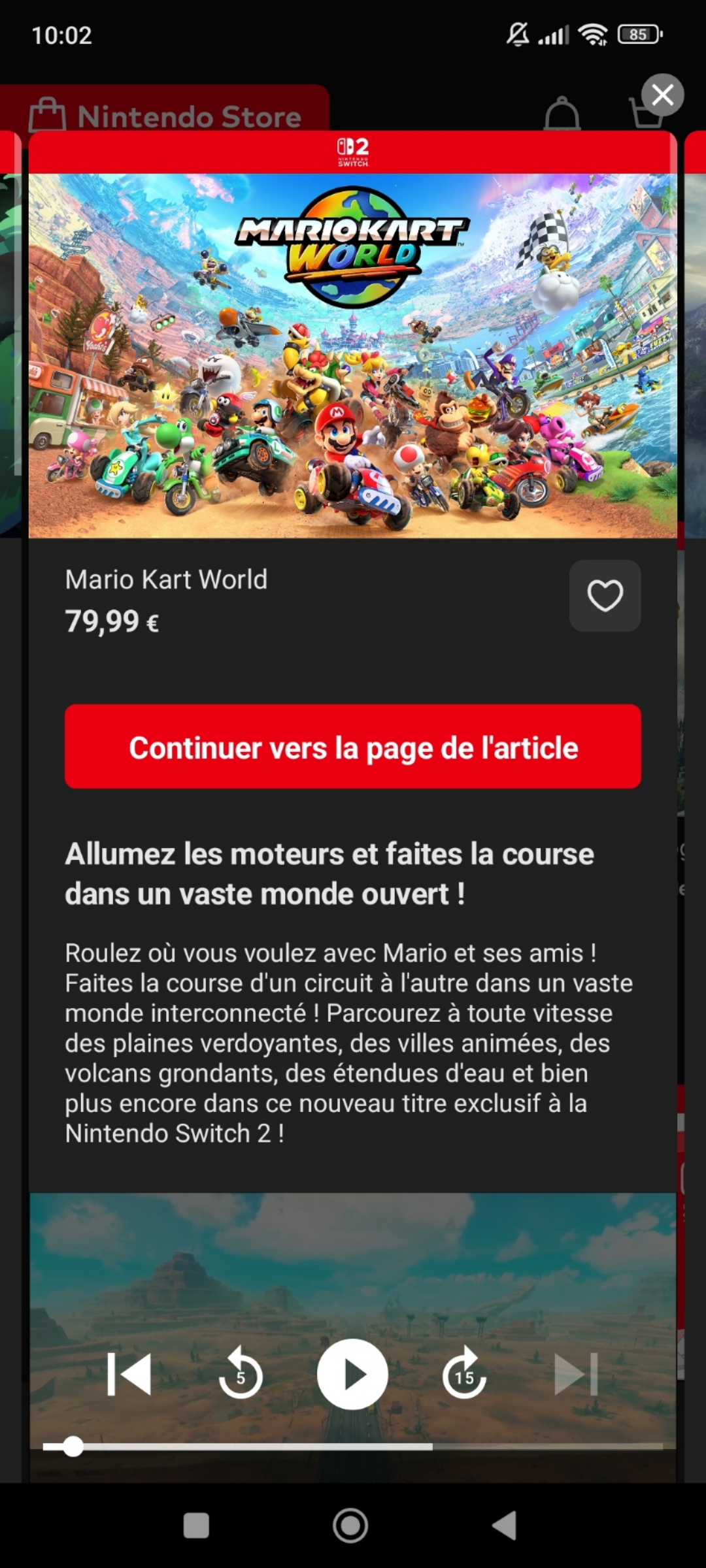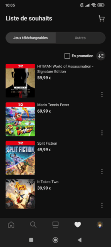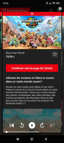 Comme son nom l’indique, le Nintendo Store permet de retrouver tous les articles Nintendo au même endroit, qu’il s’agisse de l’univers Nintendo Switch avec les consoles, jeux, manettes et amiibos, mais aussi tous les produits dérivés issus des séries Mario, The Legend of Zelda, Splatoon ou encore Animal Crossing. Chaque produit dispose d’une courte description ainsi que de quelques images et si vous souhaitez passer à l’achat, vous serez redirigé vers la version web du site de Nintendo ou du My Nintendo Store. Il est aussi possible de recevoir des notifications sur les jeux ou accessoires qui vous intéressent lorsqu’ils sont en promotion, notamment ceux qui sont dans votre liste de souhaits.