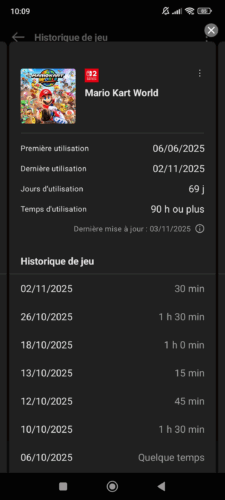 L’une des principales surprises de cette application Nintendo Store est la possibilité de consulter son historique de jeux sur Nintendo Switch et Nintendo Switch 2, et ce de manière plus que précise puisque vous pouvez voir le nombre d’heures passées sur un titre sur une journée. Des options pour classer les jeux selon le nombre d’heures ou la date d’utilisation sont présentes pour vous permettre de retrouver plus facilement les titres auxquels vous avez joués sur une période donnée. Encore plus surprenant, l’historique des jeux Wii U et 3DS est aussi proposé sur la période allant jusqu’à février 2020 (sans le détail journalier), de quoi vous replonger dans des souvenirs plus ou moins lointains à condition que vous ayez lié votre identifiant Nintendo Network à votre compte Nintendo.