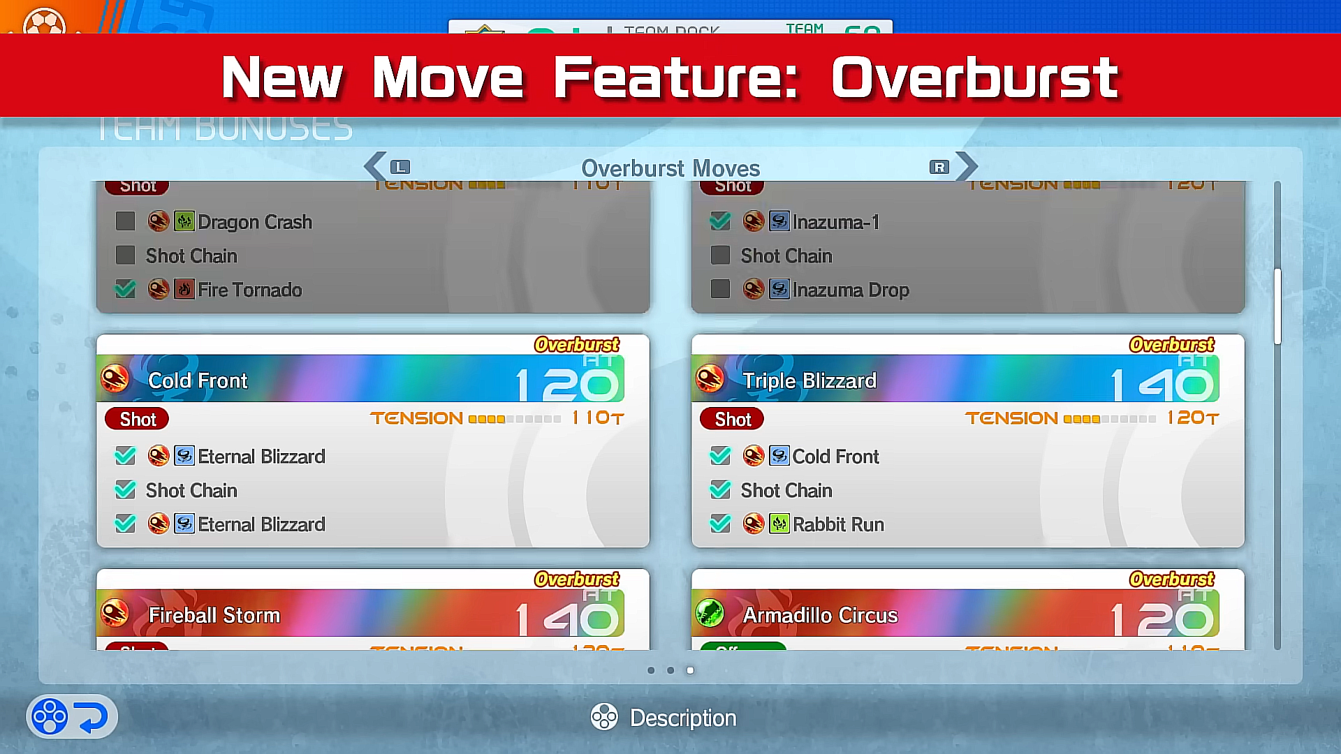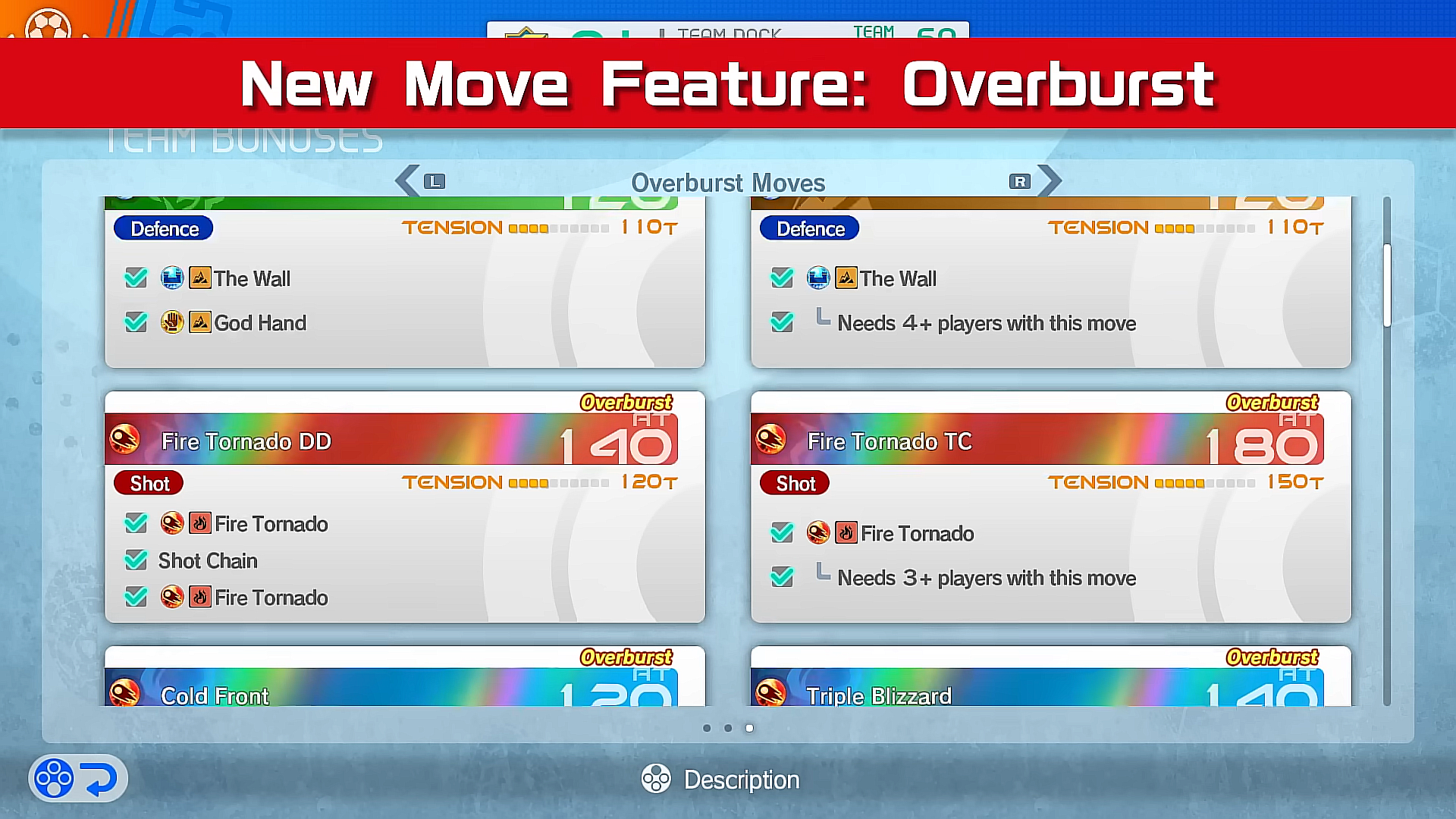 La bande-annonce nous dévoile aussi une nouvelle technique spéciale pour les joueurs, les “ Overburst Moves ”. Pour pouvoir s’en servir, il faudra remplir certains critères. Par exemple, pour utiliser “ Mur pour Un ”, quatre joueurs devront être dotés de la technique “ Le Mur ”. Pour d’autres “ Overburst Moves ”, il faudra notamment enchaîner une série de techniques précises.