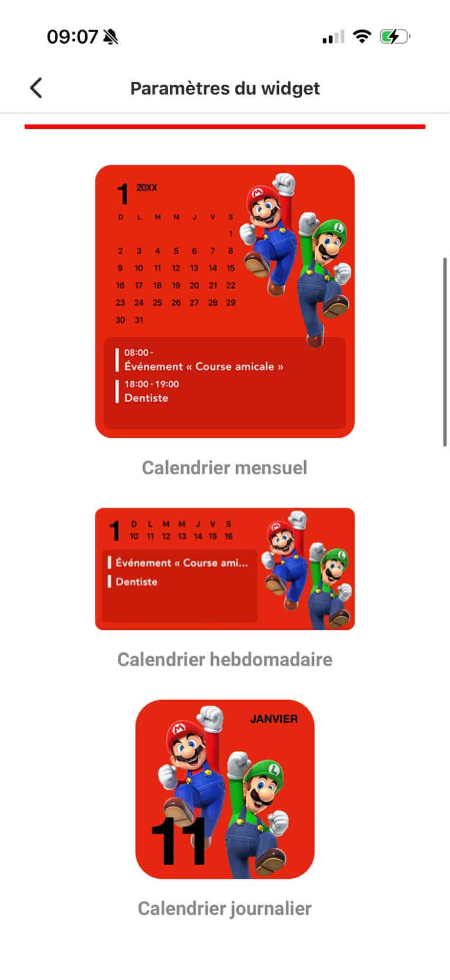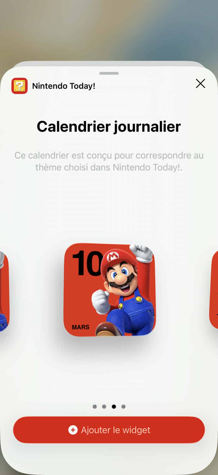 - Nous avons ajouté un widget de taille compacte équivalent à quatre icônes pour le calendrier journalier et un roulement entre des personnages de plusieurs séries telles que Mario, The Legend of Zelda, Animal Crossing et Pikmin.